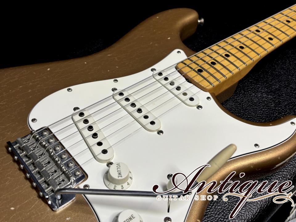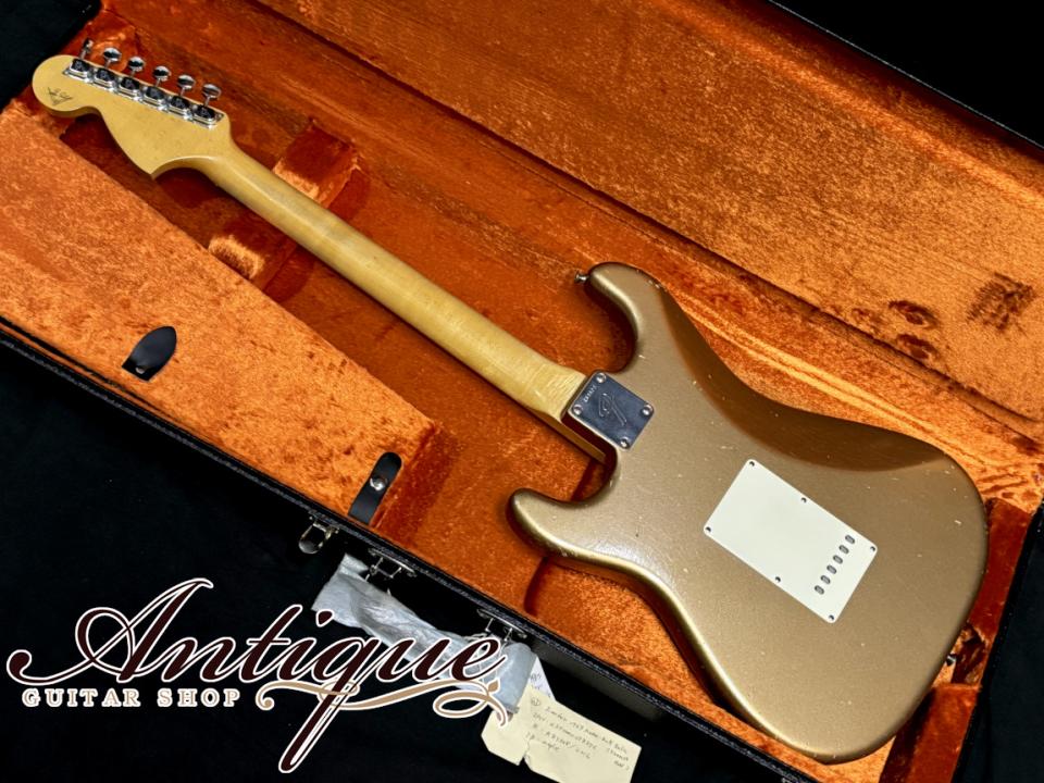 今回ご紹介させて頂くのは、現在のマスタービルダーの中でも最古参として、ロベンフォードを始めとした多くの世界的アーティスト達からも絶大な信用を受けるグレッグフェスラー氏によって製作された一本。こちらはジミ・ヘンドリックスの愛用でも知られる1969年製のストラトをリイシューしたモデルにて、レアカラーとなるファイヤーミストゴールドカラーに、長年に渡って共に旅をしてきたことを意識したリアルなジャーニーマンレリック、希少スペックとなる貼りメイプル指板、ホセフィーナ女史によるハンドワウンドピックアップ等々、他には無いレアスペックを指定し、その内容でグレッグフェスラー氏に製作してもらえるようビルダーセレクトオーダーにて製作された特別な一本になります。