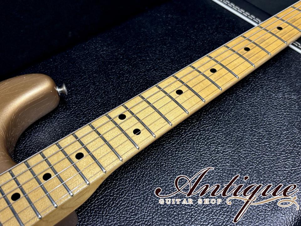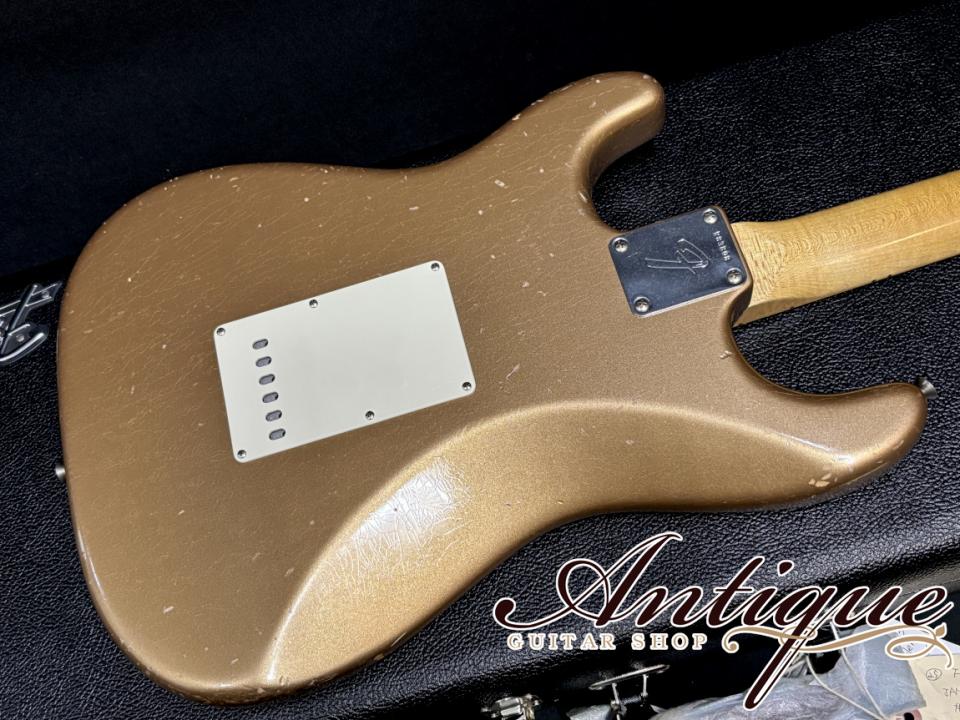 まずそのスペックとして、ボディにはマスタービルダーならではの特に厳選されたアルダー材を採用し、レアカラーとなるファイヤーミストゴールドにてフィニッシュ。そしてヴィンテージファン泣かせの激渋のジャーニーマンレリック。極薄のニトロセルロースラッカーにはビッシリと入ったウェザーチェック、長年に渡って共に旅をしてきたことを意識したリアル過ぎるエイジドワークは圧巻です。続いてメイプルネックにメイプル指板をラミネイトした所謂、貼りメイプル仕様を採用し、ネックはクォーターソーン(柾目取り)でヴィンテージライクなワイルドなフィギュアドも浮かぶ良質なメイプルにフレックも確認出来る硬質なメイプルをラミネイトした貼りメイプル仕様、もちろんネック側にもレリックが施されております。その他としてはラージヘッド&モダンロゴ&ウィズシンロゴに1ストリングガイド、12Fナロウピッチのブラックドットマーカー、白黒白の3Pホワイトガード、小さい文字のFENDER PAT.PEND刻印サドルのシンクロブリッジ、4ボルトジョイント&F刻印のジョイントプレート、Fキーチューナー、ヘッド裏にはグレッグフェスラーのシグネイチャーデカールが貼られております。また重量も約3.38kgとストラトモデルのベストウェイトになっている点も嬉しいポイントです。
