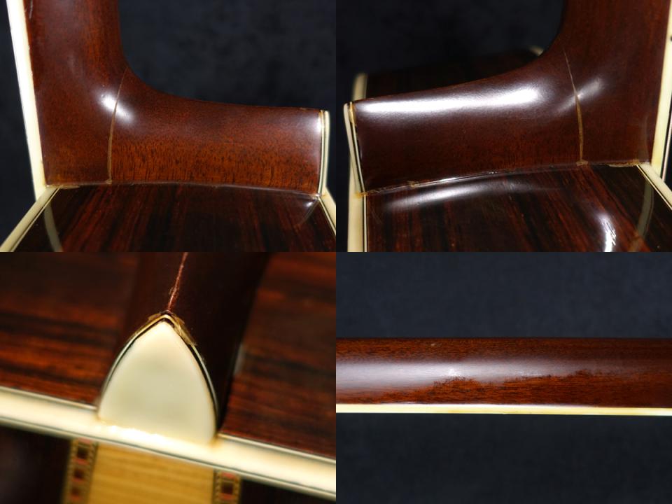 目立つ箇所ではネックヒールの継ぎ目の塗装浮き、ジョイント付近の塗装剥離、指板とネックの接着面に木部やせに伴う若干の段差が生じている他、使用に伴う塗装の艶感がネック裏に見受けられます。