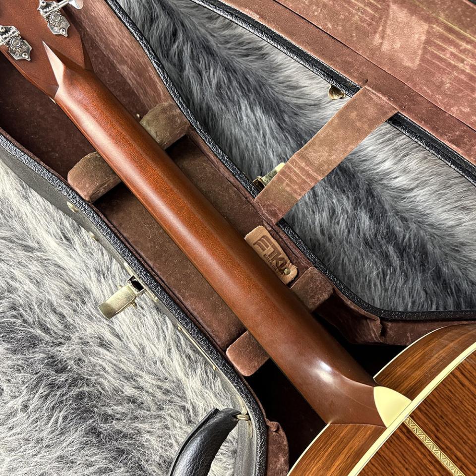 ヘリンボーントップバインディングのスプルース単板トップにローズウッドサイド&バッグを採用しております。
