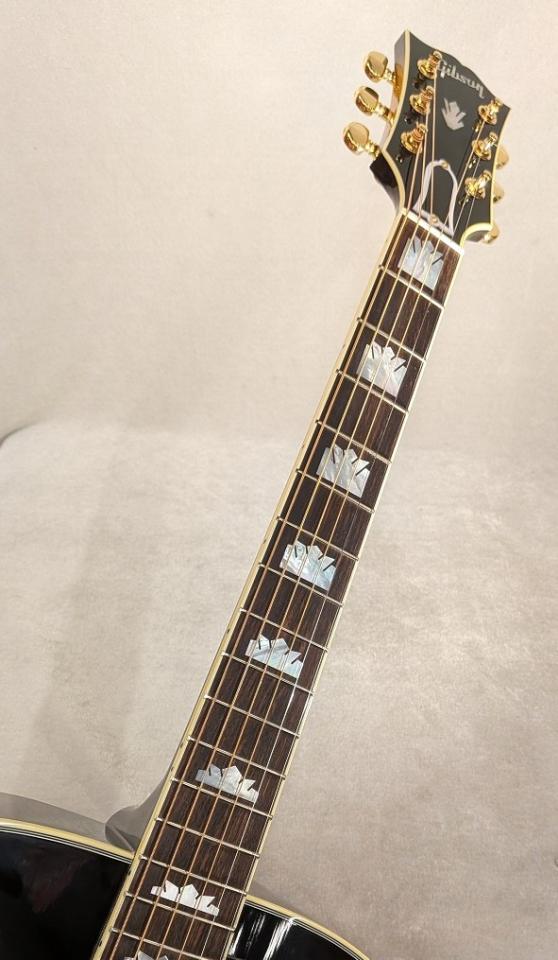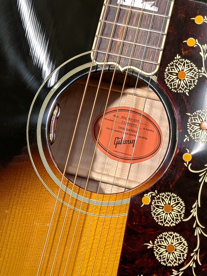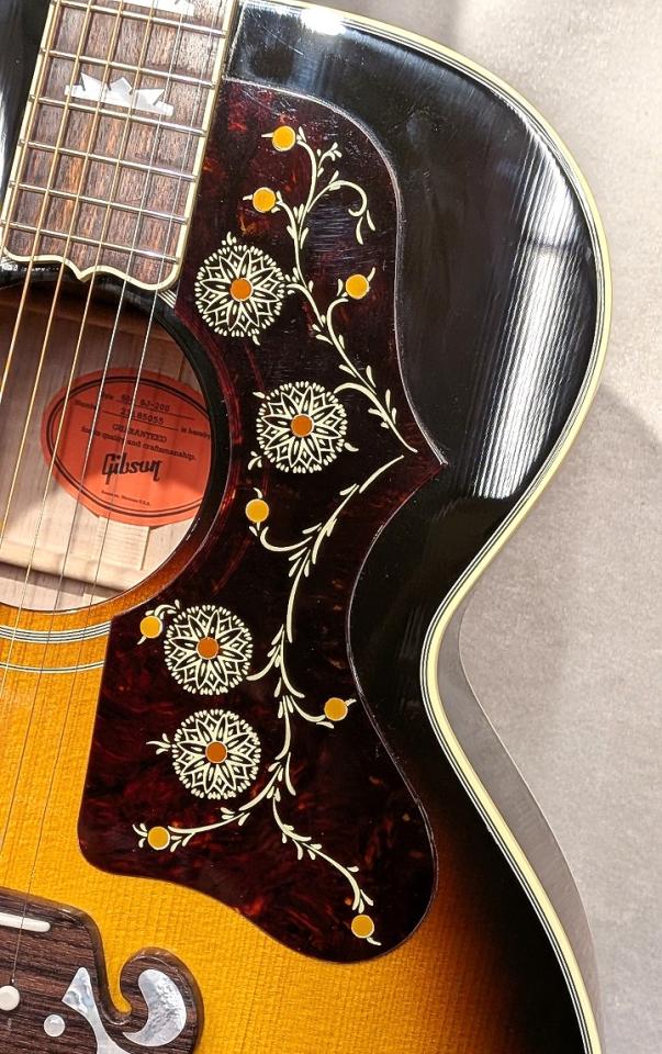 SJ-200のトレードマークでもある、花柄のピックガードの模様はプリントではなく