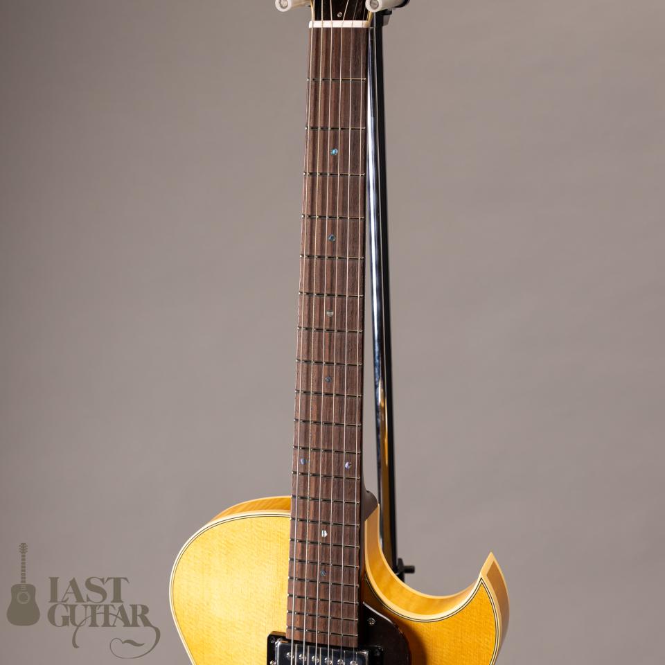 主なスペックは、薄胴の44ミリ胴厚、ハムバッカータイプピックアップ1基搭載、スプルーストップ、カーリーメイプルサイド&バック、マホガニーネック、ローズウッドフィンガーボード、636mmスケール、ナット幅43mmです。コントロールは、シンプルな1 Volume, 1 Toneです。