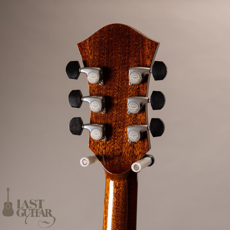 本機は、フローレンタインカッタウェイ、オープン・ポアのラッカーフィニッシュ仕上げの当店特注モデルです。またサイド&バックは見る角度によって雰囲気が変わるカーリーメイプルを採用しているのも特徴です。そしていつもハムバッカータイプのピックガードはブラックを指定しておりますが、今回はべっ甲柄に変更してみました。また渋くカッコいいルックスになっていると思います。その他にもストライプドエボニーのヘッドプレート、パーツをシルバーカラー系でまとめるなどこだわっております。さらにペグは、Gotoh 510(ギヤ比1:21)にアップグレードしており高精度です。