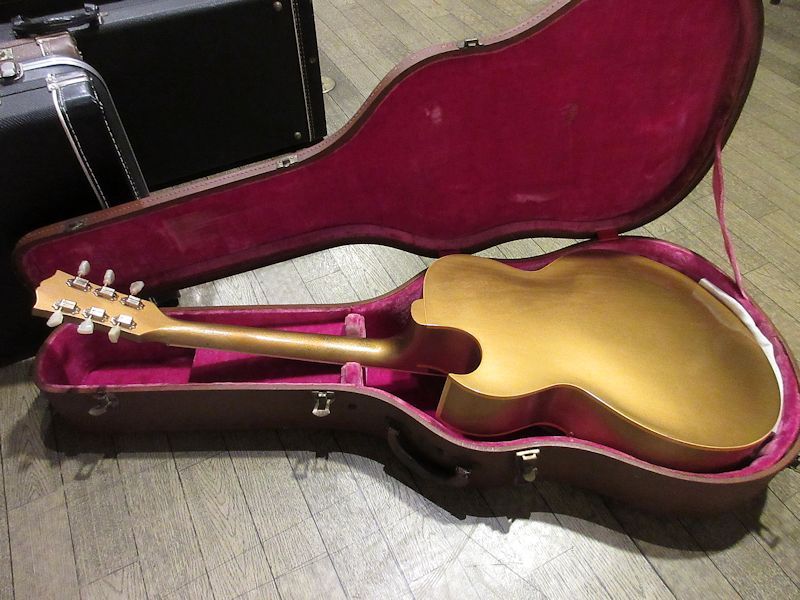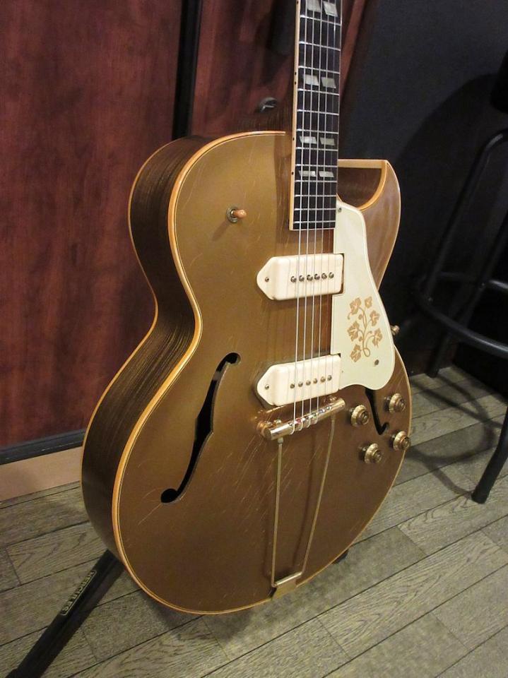 1952年から1958頃まで短期間のみ生産されていたES-295はES-175をベースとして開発され、16インチ幅のフルアコ―スティックボディーにP-90ピックアップを2基搭載。オールゴールドフィニッシュ&ゴールドハードウェア、加えてダブルパラレログラムポジションマーク、フラワーパターンのピックガードがあしらわれた、50年代アメリカのカルチャーを感じるルックスが魅力のモデル。故スコッティー・ムーア氏をはじめ、Char氏や奥田民生氏も愛用していることで知られています。本機は1955年製、フルオリジナルで素晴らしいコンディションをキープした個体!それもそのはず、数十年前にアメリカで購入され、国内ワンオーナーで長らく大切に扱われてきた1本。フルアコ特有のふくよかな生鳴りに、P-90ピックアップによるファットでレンジ感豊かな絶品のサウンド♪175のウッドブリッジとはまた異なるトラピーズテイルピース独特の響きはウォームでクリスピー、リイシューモデルとは一味違うGibson黄金期の50年代フルアコサウンドが存分に楽しめます!このクラスのES-295は昨今中々お目にかかれないレアピースですので、この機会をお見逃しなきよう!こちらも素晴らしいコンディションのオリジナルブラウンハードケースが付属致します。