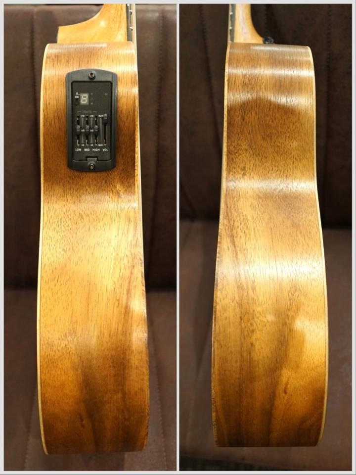 バックのサップが見事な杢目。トップ、サイド&バックにハワイアンコアを使用。ハワイアンコアをボディ全面に使用、輝きのある高音が魅力。
