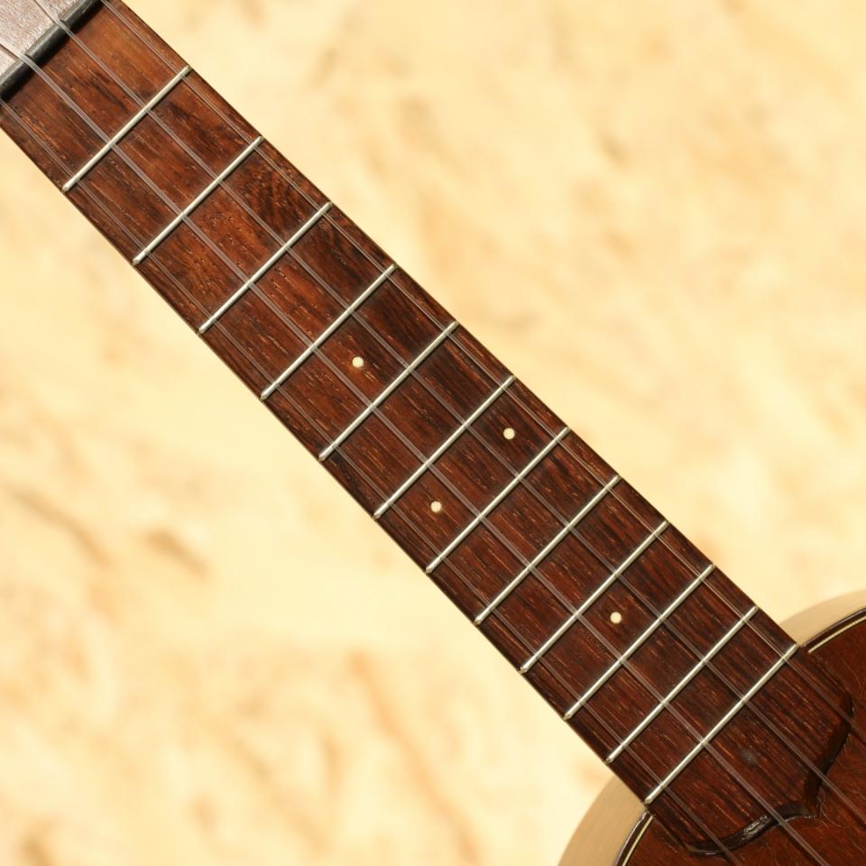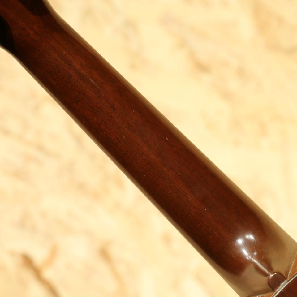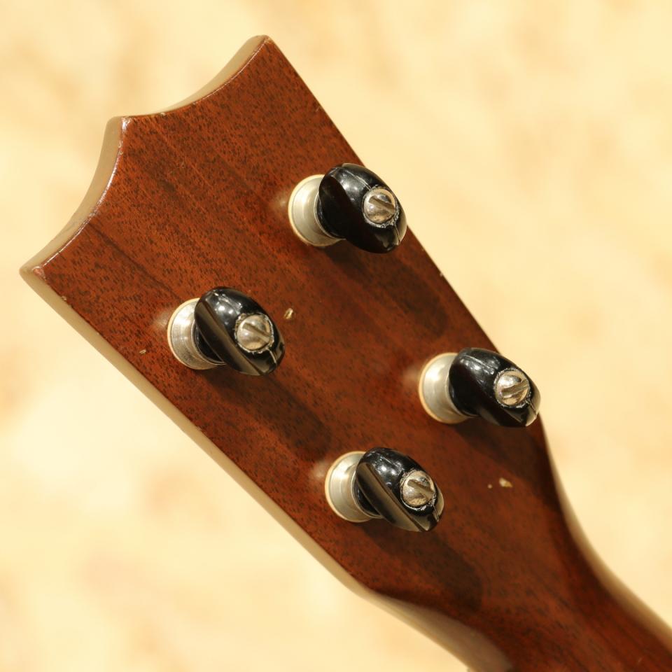 ギターブランドとしてはもちろん有名ですが、100年を超えるウクレレ生産の歴史も持っており、現代までも続く老舗ブランド”MARTIN”。本器は1924年から1965年頃まで生産されていたスタンダードモデルのコンサートサイズ"Stayle-1C"。1940-50年代製と思われる1本。ワンピースマホガニーボディ、ワンピースマホガニーネック、ローズウッド指板、マホガニーブリッジ、アイボロイド指板ドット、ワンリングロゼッタ、暗色プラスチックトップ&バックバインディング、フリクションペグ、ボディエンドストラップピン装着。マホガニーらしいふくよかでカラッとしたトーン。しっかりと音量もあり聴き手も弾き手も満足度の高い1本。爪弾けばメロウで優しい音色も奏でます。ボディバック面のみ塗装の上吹きが見られますがさほど違和感は無く雰囲気は損なわれていません。1弦側サイド面にやや深い打痕、その他全体的にも打痕や擦り傷、ウェザーチェックが見られますが割れ修正は無く、経年を考慮すれば良好な状態といえます。同年代のソプラノモデルとすると市場の出物も少ないコンサートモデル、是非お見逃しなく。チップボードケースが付属します。