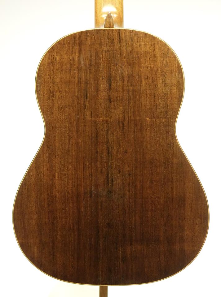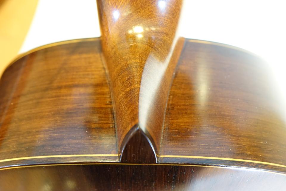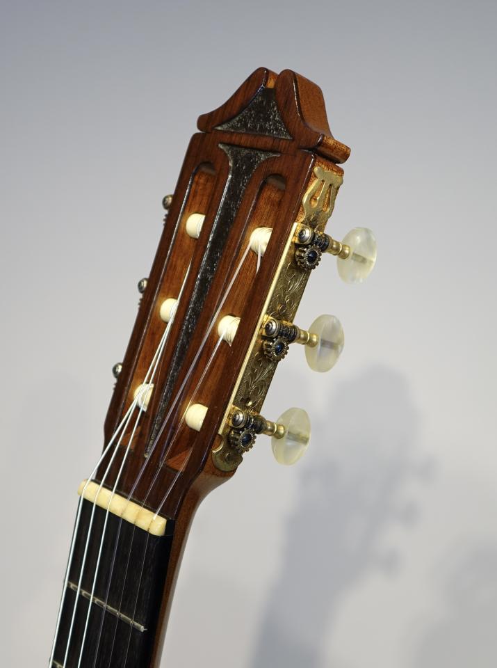 表板はスプルース、裏・横にはハカランダ、糸巻はフステロで、ナットは恐らく一度も変えられていない、黒檀と象牙を張り合わせたものです。