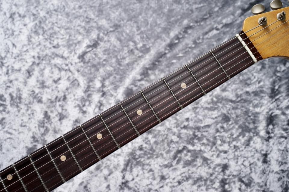 指板は選定された3Aグレードの色の深いローズ指板をスラブ貼りしたものとなります。