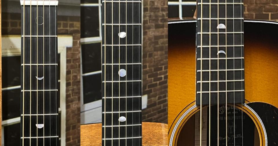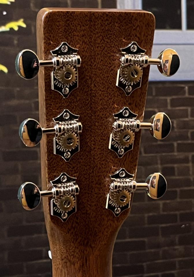 ユニークなディテールとしては、指板に施されたカスタムムーンフェイズインレイ、シルバーのマーティンヘッドプレートロゴ、オーバルチューナーボタン、ヴィンテージサンバーストトップなどが挙げられます。