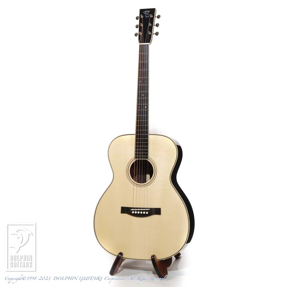 OMモデルをベースに、ディープボディヴァリエーションを選択した意欲的な一本。スリムなロープロファイルネックを採用し操作性は抜群です。トップにはアディロンダックスプルースを採用し、そのブレイシングにもアディロンダックスプルースをニカワ接着でヴォイシングしています。レスポンスの良さと透明感のある中高域、OMサイズながらもディープボディによりさらに中低域の音の深みと広がり、音圧もサイズ以上のサウンドが味わえます。