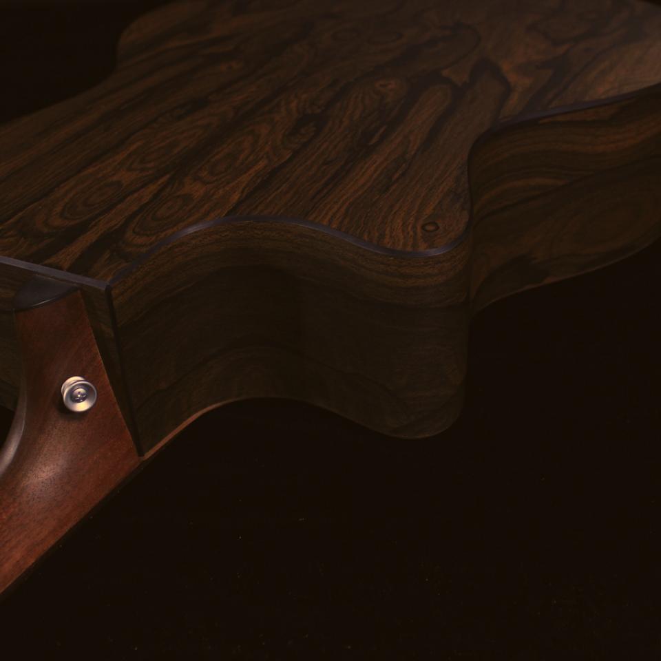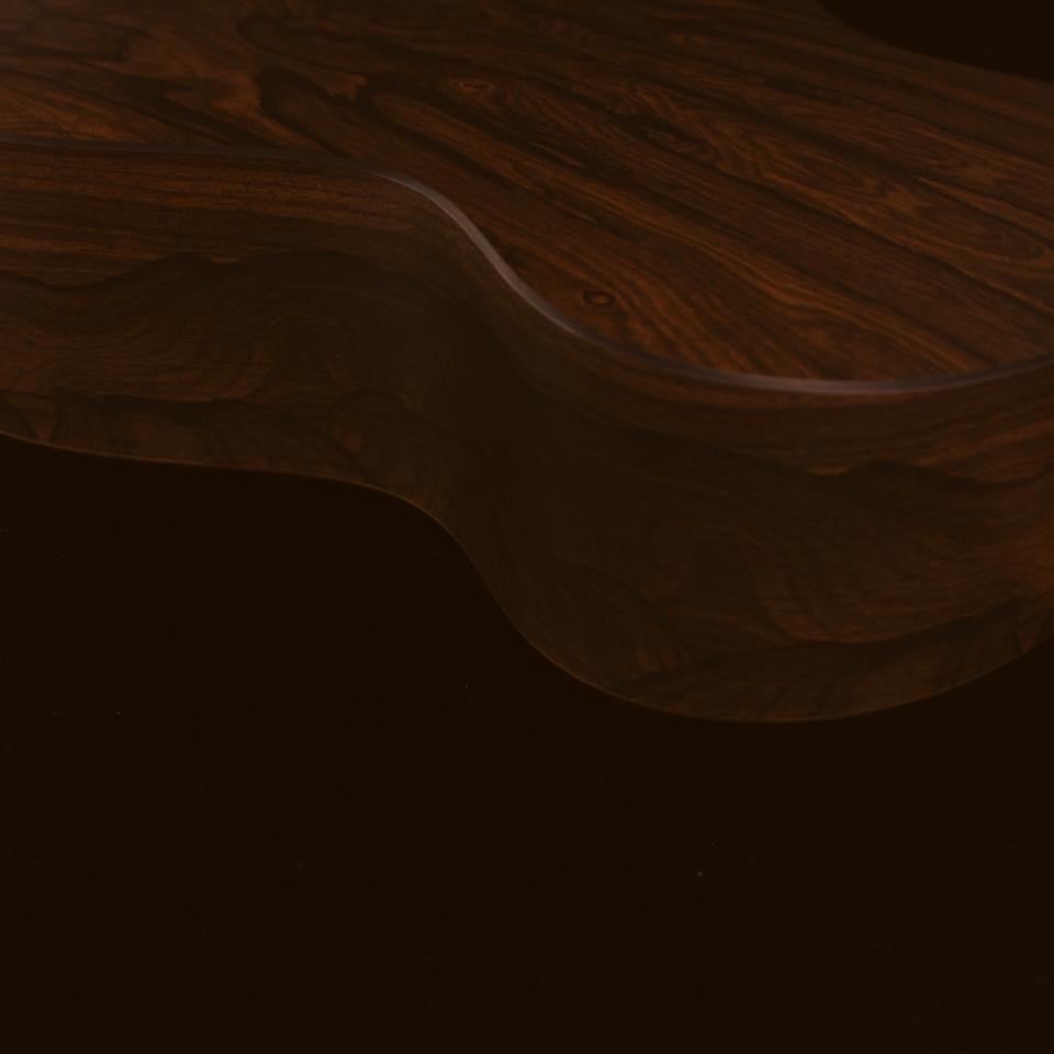 トップにはサペリ単板を使用し、サイド&バックにはHPL(ハイプレッシャーラミネート)を採用。木片や木粉などを樹脂とともに高圧縮して成形するHPLは、温度や湿度の変化に強く、扱いやすさに優れた素材です。外観にはエキゾチックなジリコテ材の杢目を再現したフィニッシュを施し、個性的で存在感のあるルックスに仕上げられています。全体はサテン塗装でまとめられ、さらりとした手触りとナチュラルな質感が魅力。工程を合理化することで薄めの塗膜を実現し、トップ単板ならではの豊かな響きをしっかりと引き出します。