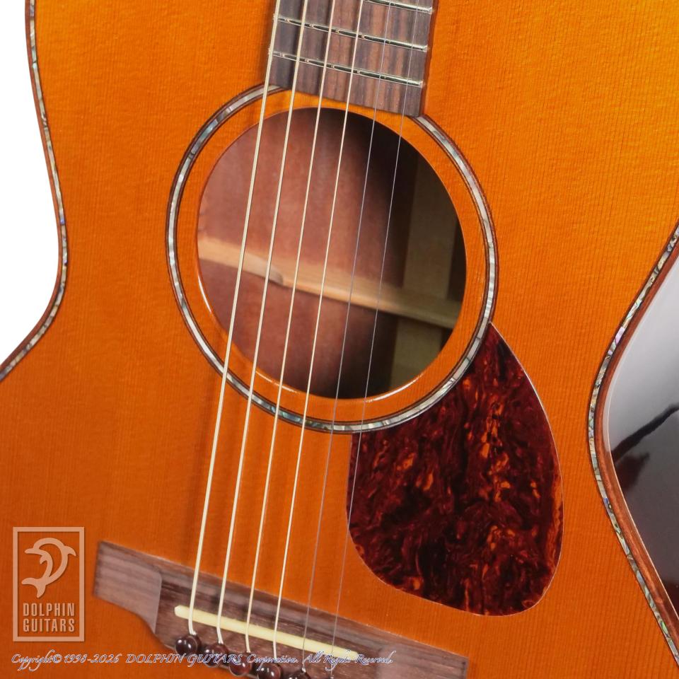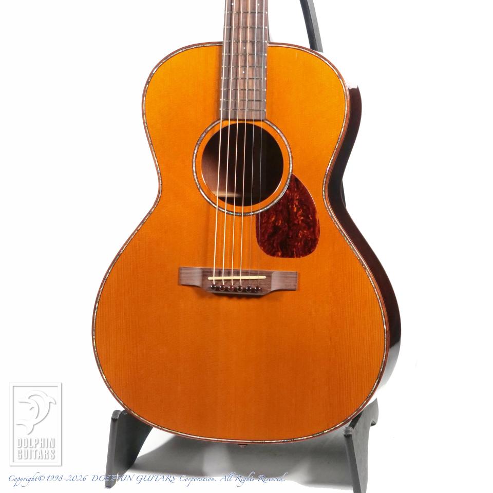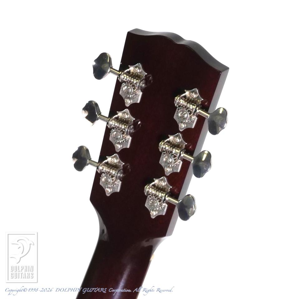 ギブソンスタイルの作品が多く、本器はL-00タイプのシェイプをアバロンで綺麗に飾ったユニークなモデル。アンバーフィニッシュにコントラストが効いた白木のパーフリングも小洒落ております。