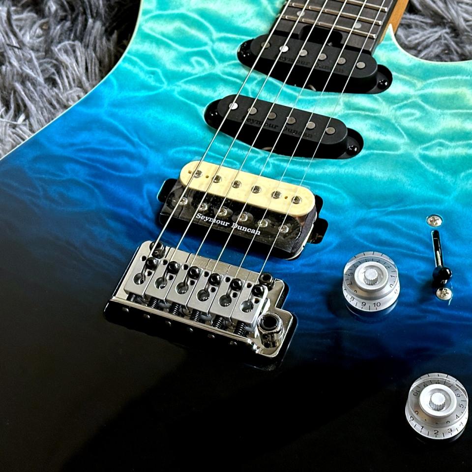 ピックアップはHSS構成で、ブリッジにはダイレクトマウントのSeymour Duncan Full Shred TB-10、ミドルにはダイレクトマウントのSeymour Duncan Custom Flat Strat SSL-6シングルコイル、ネックにはSeymour Duncan Custom Flat Strat SSL-6 RWRPシングルコイルを搭載。ハムバッカーらしいしっかりとした歯切れのあるサウンドと、ヴィンテージ感あふれる生き生きとしたトーンを兼ね備えています。