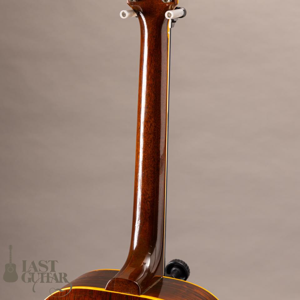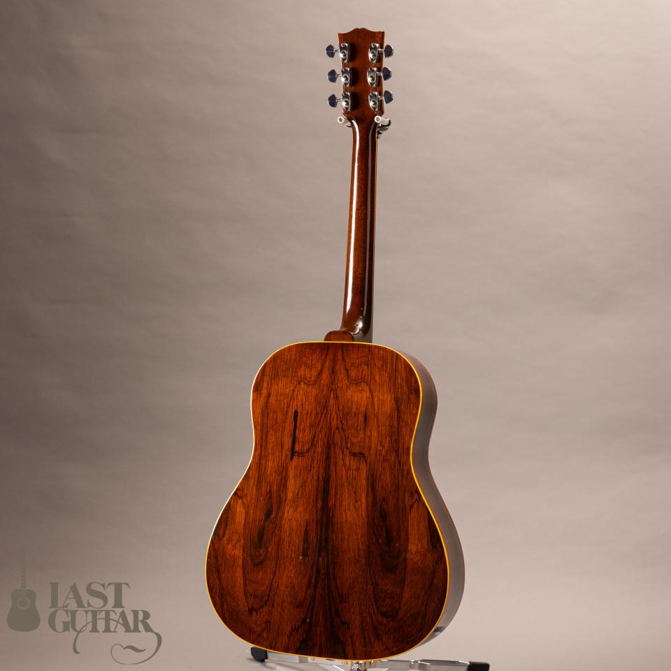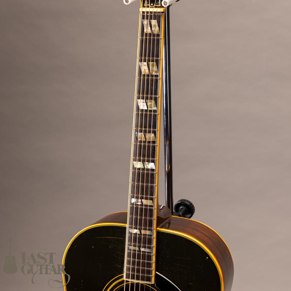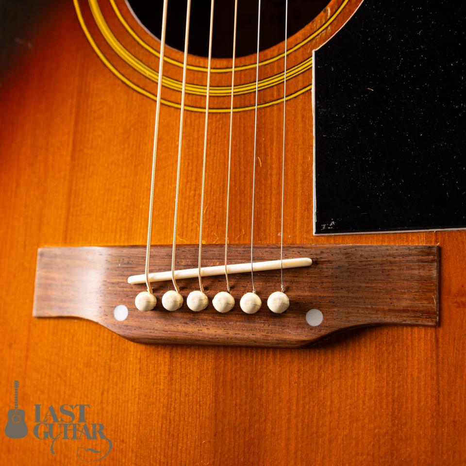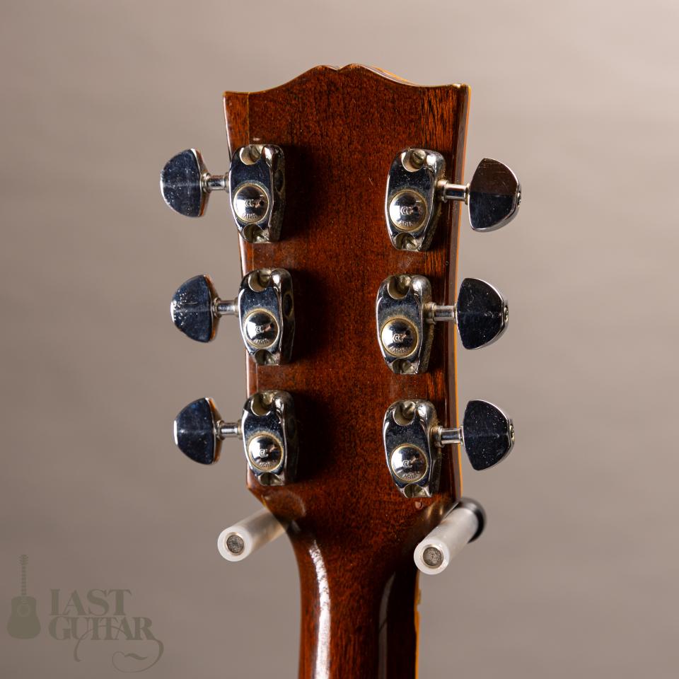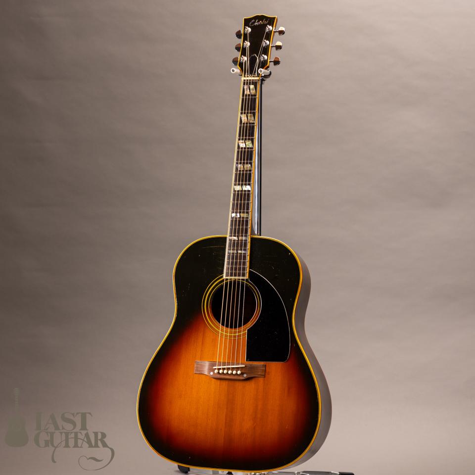 本機は、ギブソンSJモチーフしたようなラウンド・ショルダータイプのフラットトップギターです。紙ラベル期の個体で、製造は、1970年代と思われます。フェイドしたサンバーストカラー、色づいたバインディングなど貫禄たっぷりの風貌です。