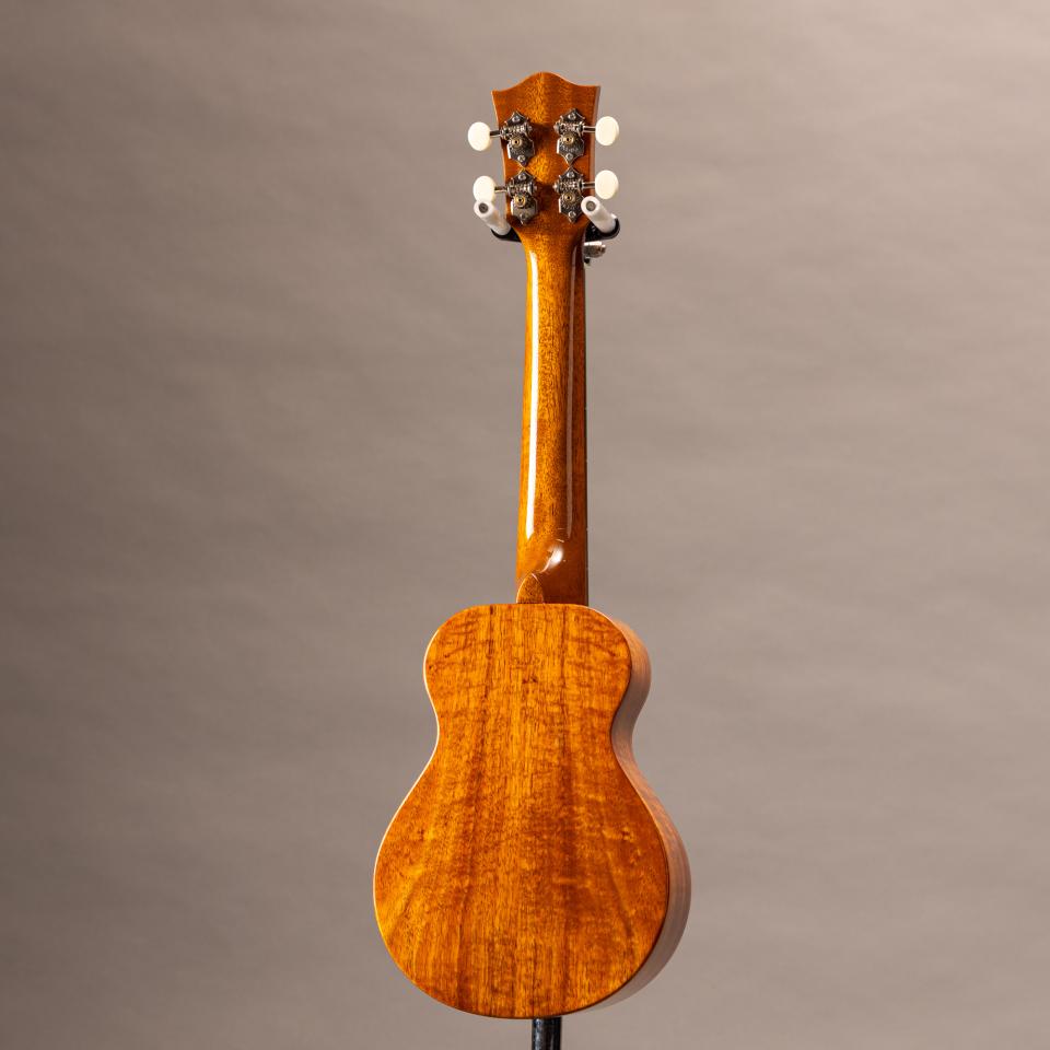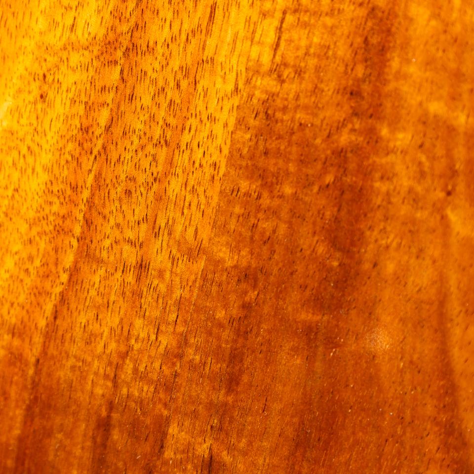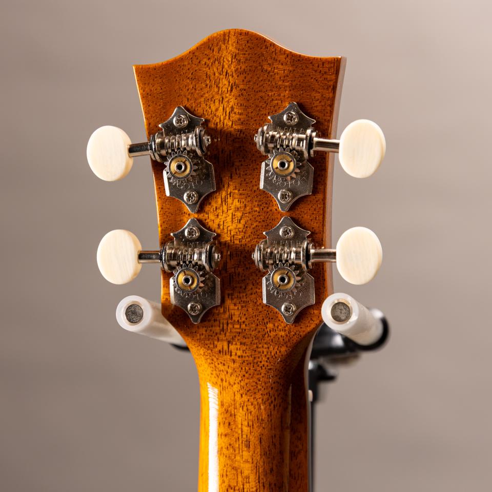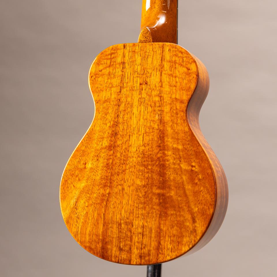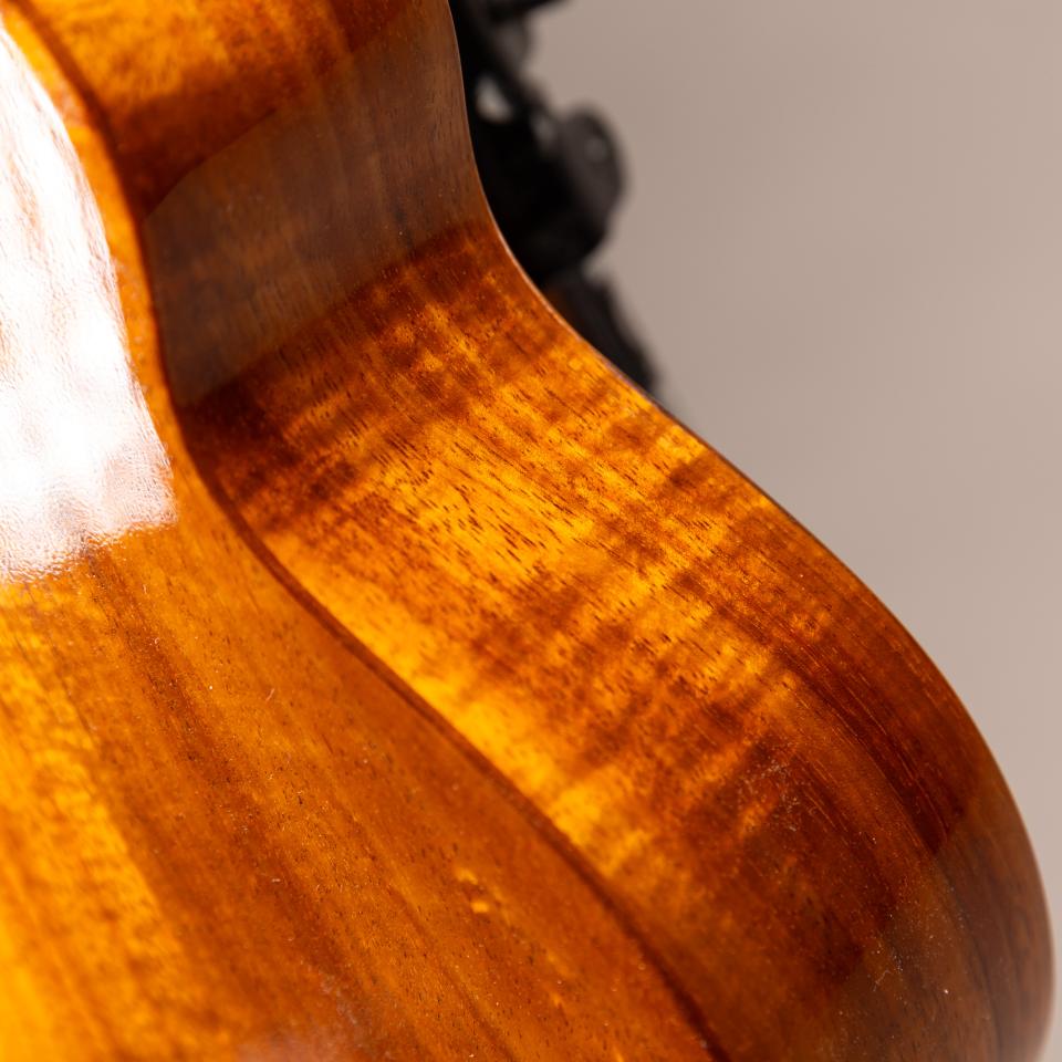 ボディに使用されているのは2Aグレードのハワイアンコアで、キャラメルカラーの柾目にカーリーが優しく入った美しい個体です。