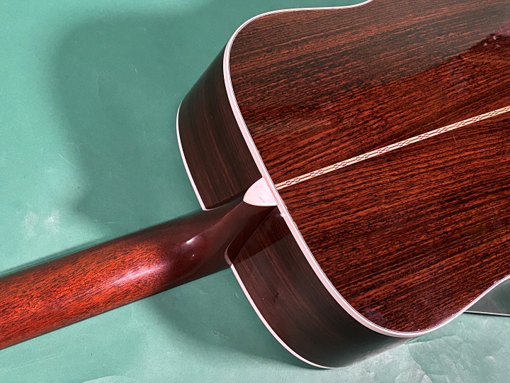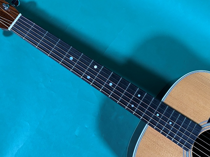 ナット幅:42.9mm(実測)、スケール:645.2mm(実測)。ナットとサドルはボーンです。現行品のD-28 Standardのナット幅は約44.5mmですので、42.9mm幅のロープロファイルネックは貴重です。