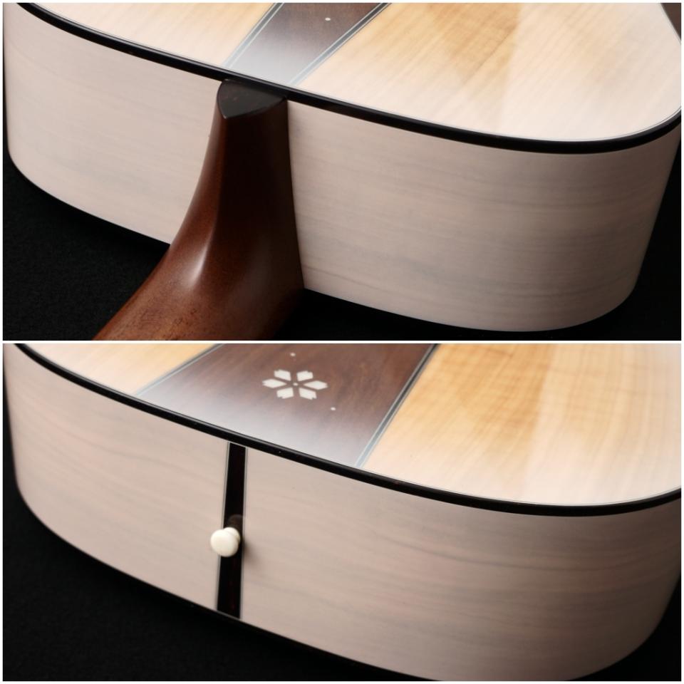付属するサウンドホールカバーには、桜と“舞い降る雪”を組み合わせたデザインの中に、和傘の女性が細やかに描き込まれています。