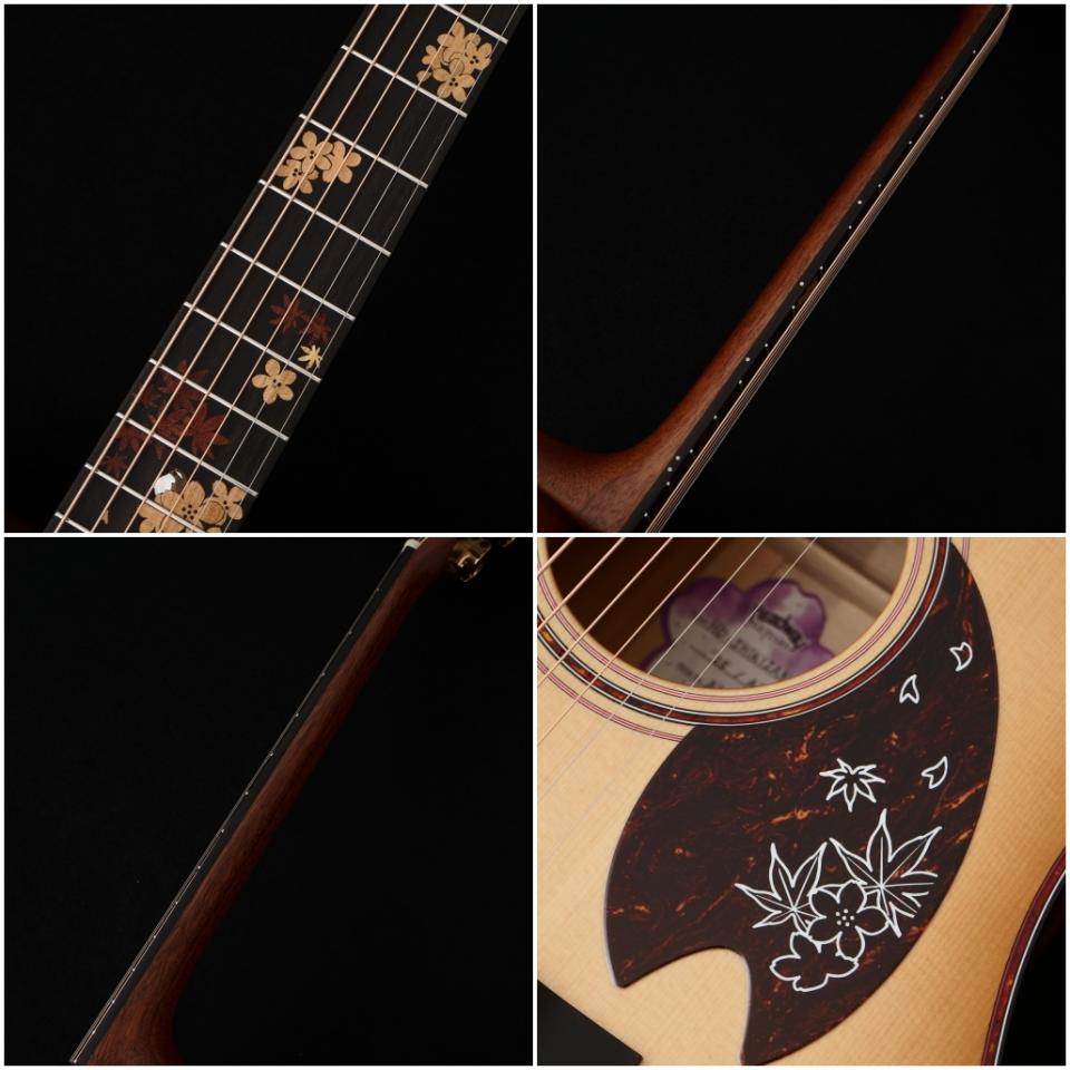 サウンドホールカバーには桜ギターの象徴とも言える和傘の女性を描き、舞い散る紅葉の中に佇む情景を表現しています。
