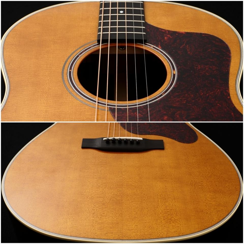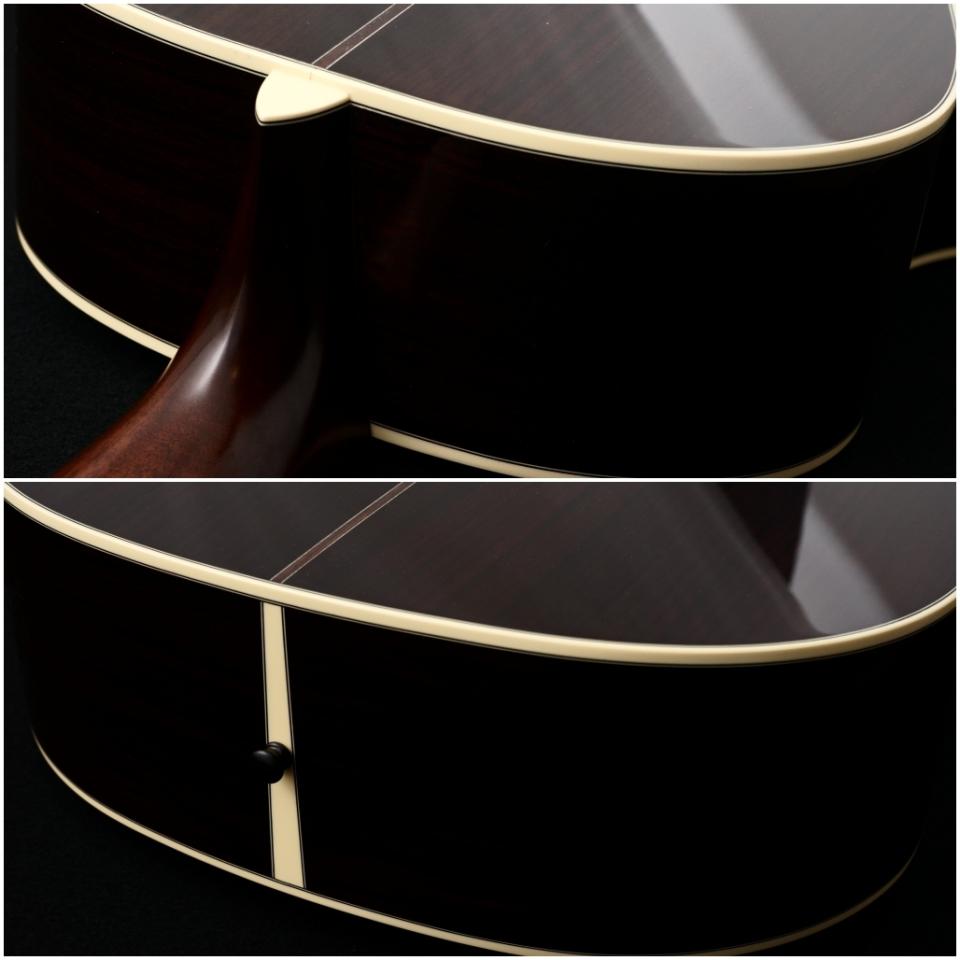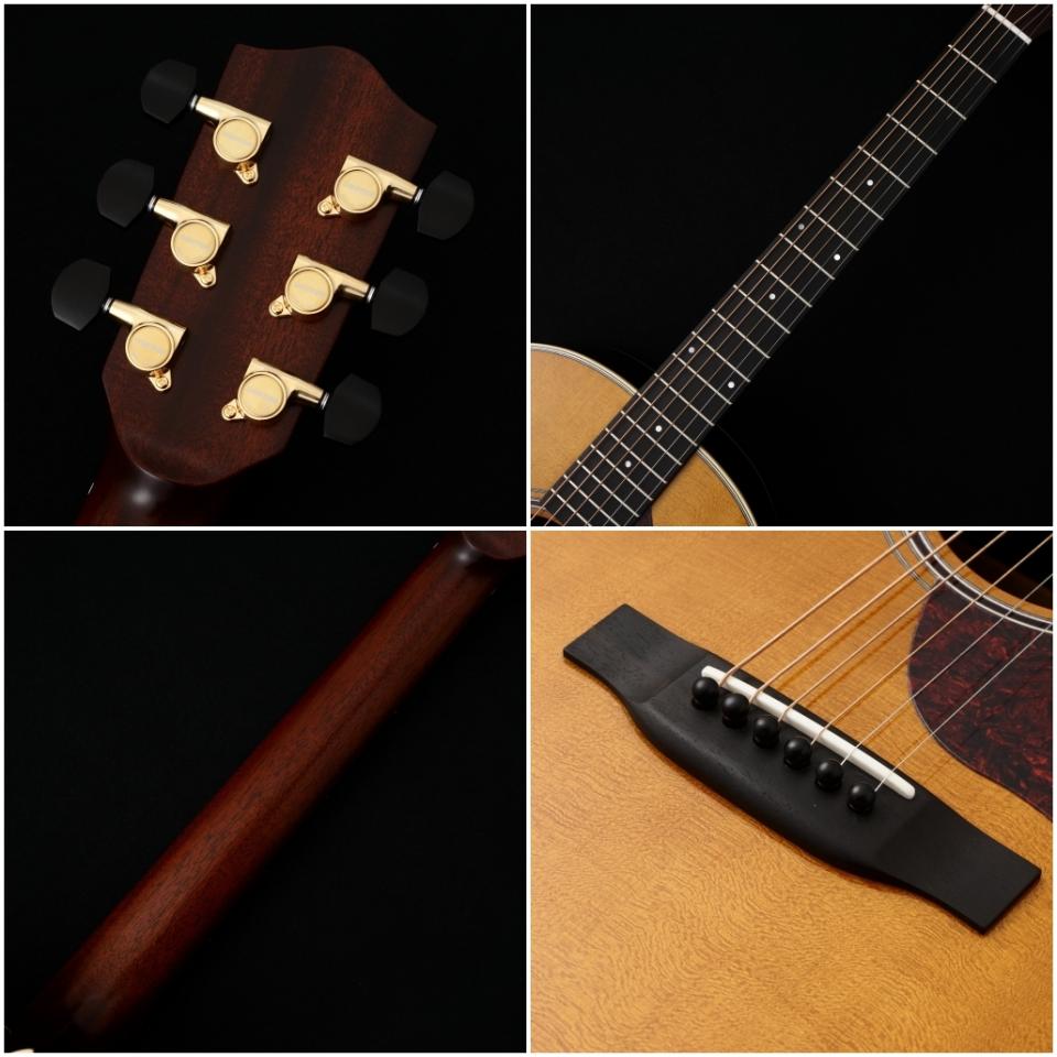 木材は厳選されたシトカスプルーストップ、インディアンローズウッドサイド&バック、ややスリムで握り心地の良いアフリカンマホガニー1Pネック、エボニー指板&ブリッジの組み合わせ。