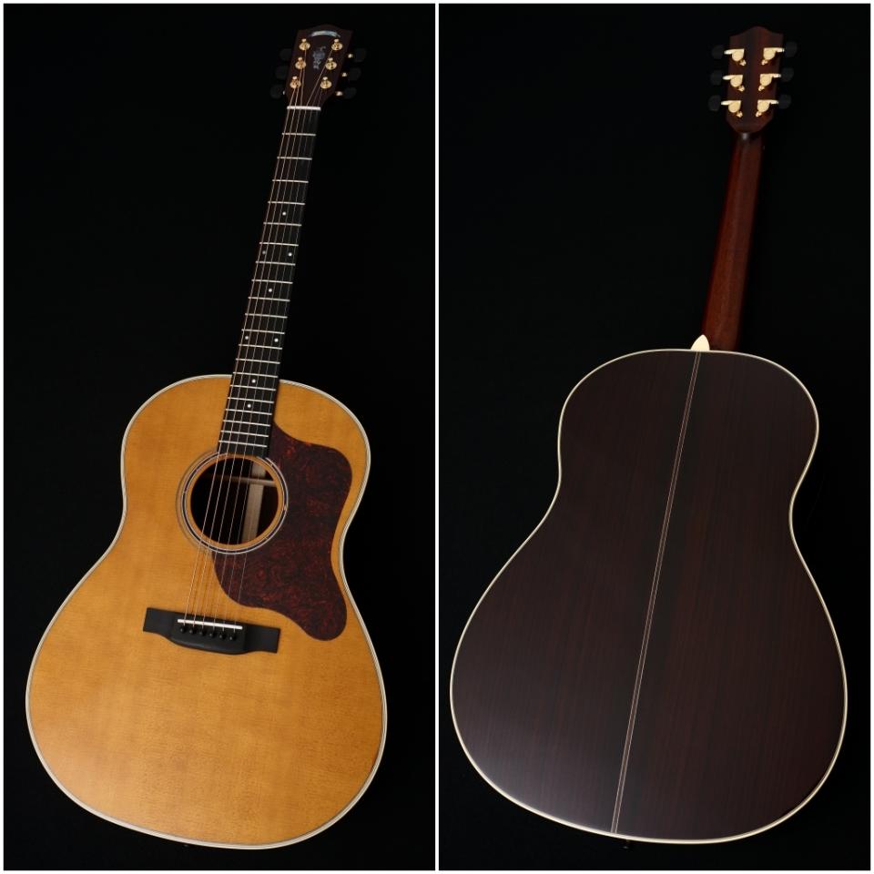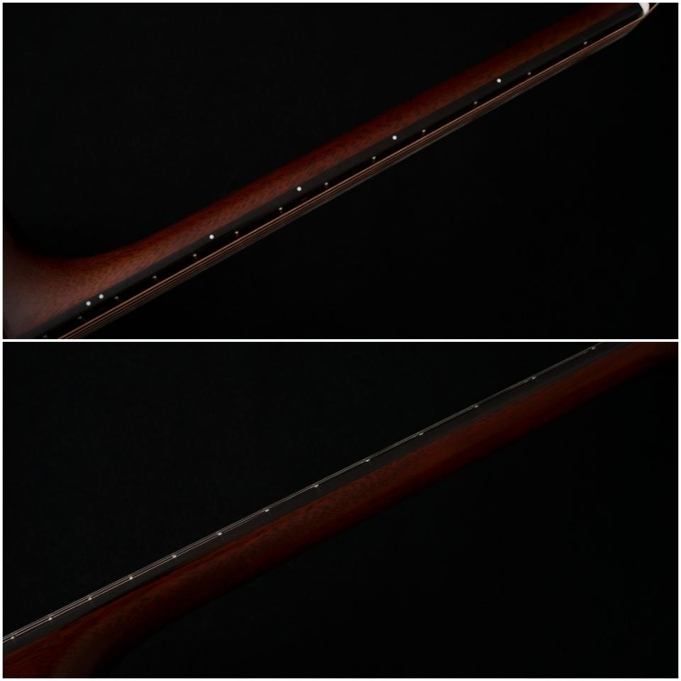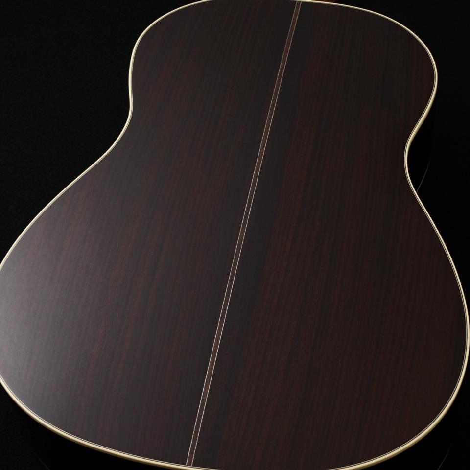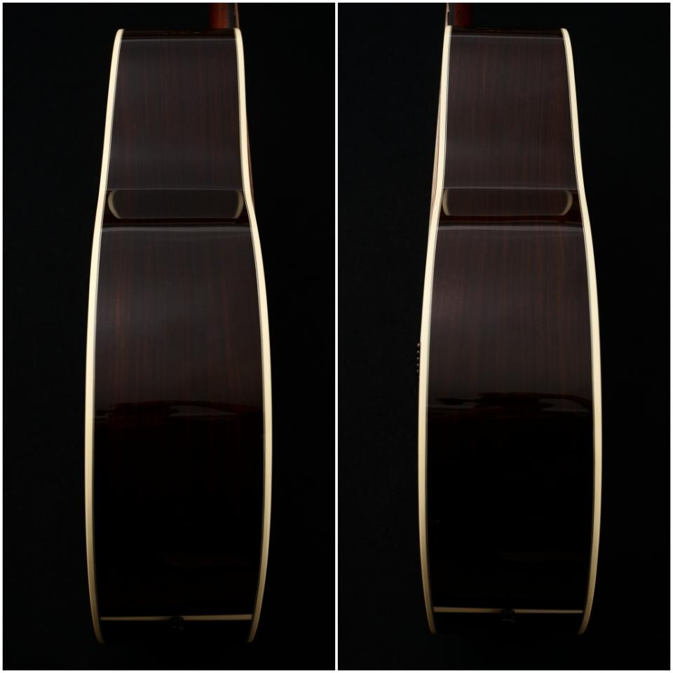 木材は厳選されたシトカスプルーストップ、インディアンローズウッドサイド&バック、ややスリムで握り心地の良いアフリカンマホガニー1Pネック、エボニー指板&ブリッジの組み合わせ。