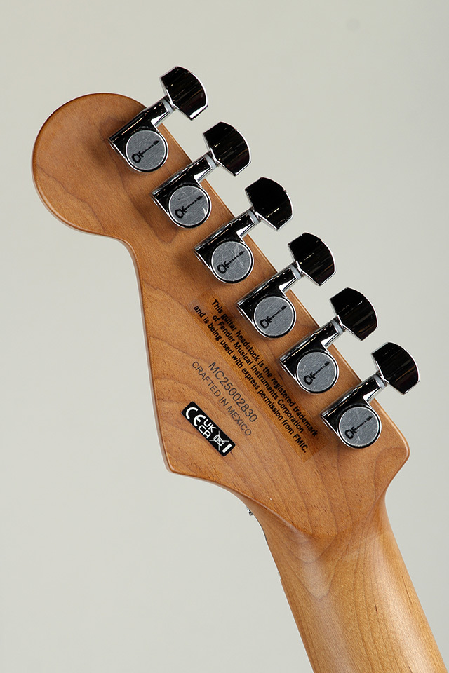 豊かでダイナミックなトーンを奏でるキルトメイプルトップのアルダーボディには、グラファイト補強ロッドを内蔵したボルトオン式キャラメライズドメイプルネックを装備し、温度や湿度などによる環境変化の影響を最小限に止め、高い安定性を実現します。キャラメライズドメイプル指板は12-16インチのコンパウンドラジアス仕様で、滑らかにロールオフ処理されたエッジと、4mmパーロイドドットインレイを採用しています。薄めのDシェイプネックと22本のジャンボフレットも、より速く、優れたプレイアビリティに寄与します。また、蓄光式Luminlayサイドドットは、暗いステージでも容易にフレットポジションを視認することを可能にします。