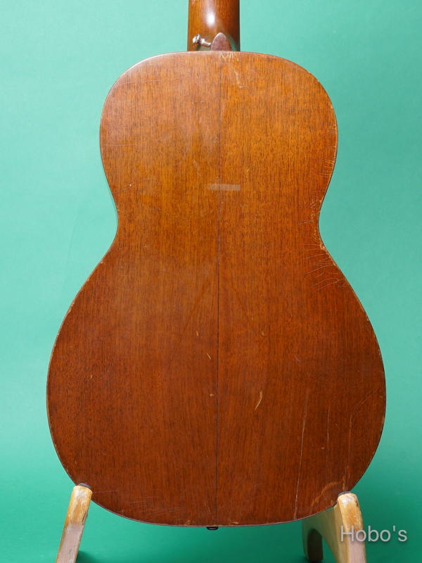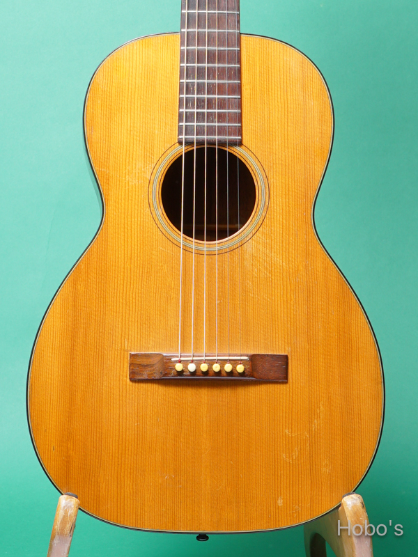 表板には経年変化による日焼けやウェザーチェックが見られ、サウンドホール周辺に軽微な弾き削れ有り。ボディやネックなど、全体的に打痕やキズがあり、ネック裏に塗装剥離がございます。その他裏板下部にクラック補修跡有り。エンドピンジャック加工跡はなく、ヘッドロゴは綺麗に残っております。オリジナル・チューナー、ブリッジ、フィンガーボード、フィニッシュ。セミハードケースが付属致します。後付けでネックヒール部ストラップピン装着済み。当店工房にてネックリセット済み。
