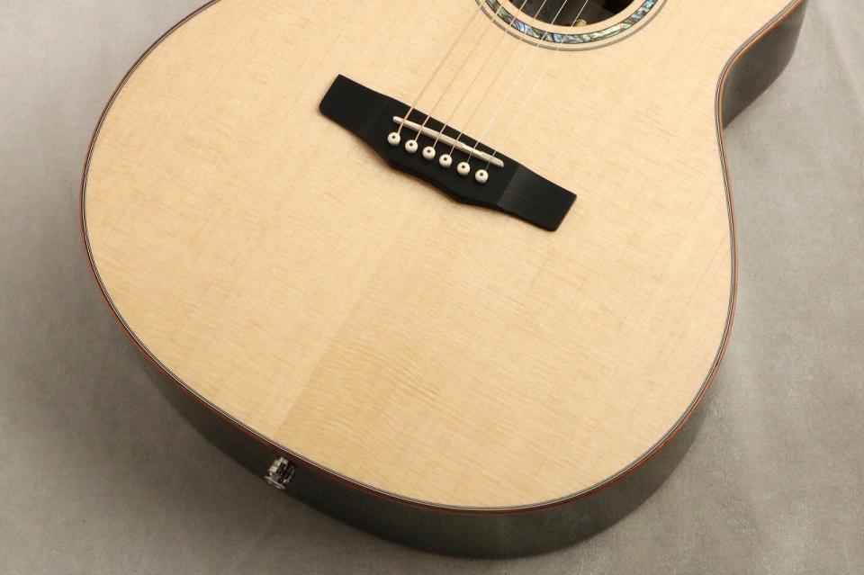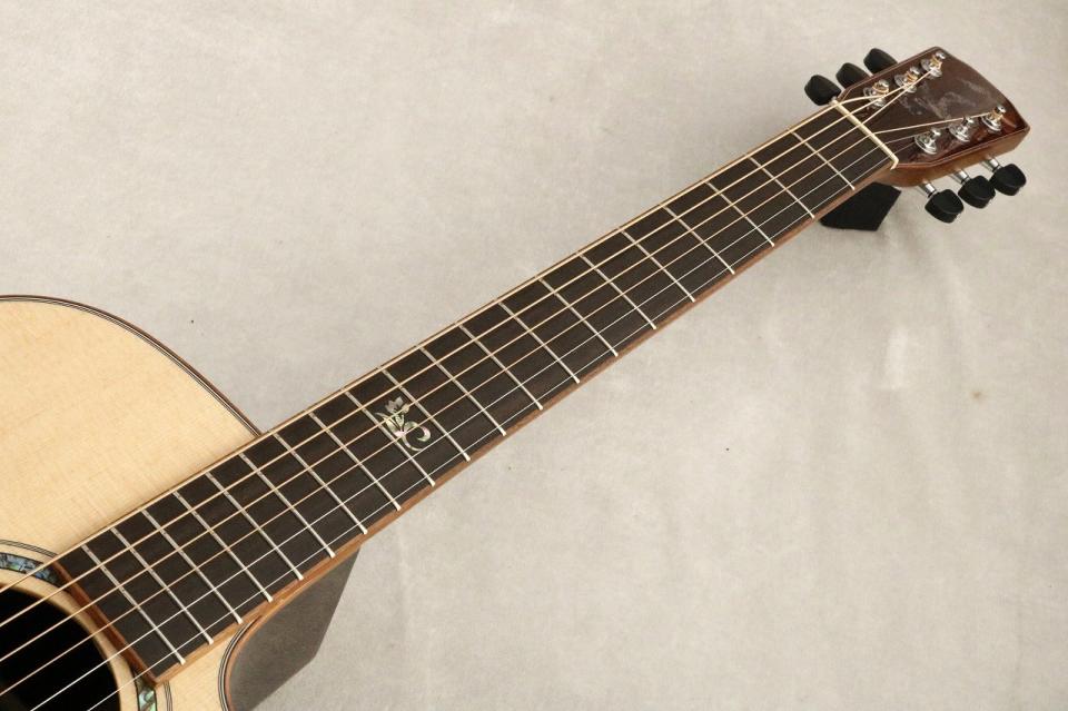 フィンガースタイルに特化し、ソロギターでの演奏性を追求したSシリーズの中心的モデルの一つS-101。2000年、それまで弾き語りを主とする国内アコースティックギターの流れに新たに生まれて定着しつつあったフィンガーピッキングスタイルの演奏を目の当たりにしたMorrisは2001年これから弾き語りを超えてスタンダードになっていくであろうフィンガースタイルに特化したシリーズ「Sシリーズ」を発表します。弦長、ネックシェイプ、ナット溝の位置、ネックの仕込み角度、ボディの構造、サドルの仕込み位置、塗装、細部に渡るまでフィンガースタイルで演奏する事を想定した設計となっているSシリーズ。そのSシリーズのスタンダードであり定番木材の組み合わせを持ったモデルがS-101Ⅲです。シトカスプルーストップとインディアンローズウッドサイド・バック。オール単板のボディにトップブレーシングはXXブレーシングにバックはローズウッド単板ながらディープラウンドにXブレーシングという手の込んだ造りになっています。これにより低音から高音まで淀みが少なくクリアでハッキリとしていながら深い残響感と伸びを持った響きを実現しています。特に、重量のあるローズウッドはサスティーンに定評があれど立ち上がりが重たくなりがちで軽いタッチのフィンガースタイルでは鳴らない印象になりがちですが、MorrisSシリーズのローズウッドサイドバックは立ち上がり良く伸びのある美しいサウンドが叶えられており軽いタッチでも気持ち良く演奏が出来ます。派手過ぎずお洒落な外観も魅力。指板12フレットにはリンドウの花を模したインレイが埋め込まれ、サウンドホールロゼッタもアバロン貝の美しい装飾。ボディ全体に色味が明るく美しい杢目をもったコアのバインディングを採用しており木材の温かさを感じる外観になっています。バインディングやインレイだけで見ても非常にきれいなものが採用されており手に取って各部眺めてしまいたくなる外観。ディープラウンドバックならではの迫力がありフィンガースタイル特化モデルながらフラットピックでのストロークサウンドも抜群です!ボリューム/トーンコントロールの無いシンプルかつ高品質なエレアコサウンドを出力可能ななB-BAND/UST-25R搭載でエレアコサウンドGood!是非この機会におてにとって見てください!