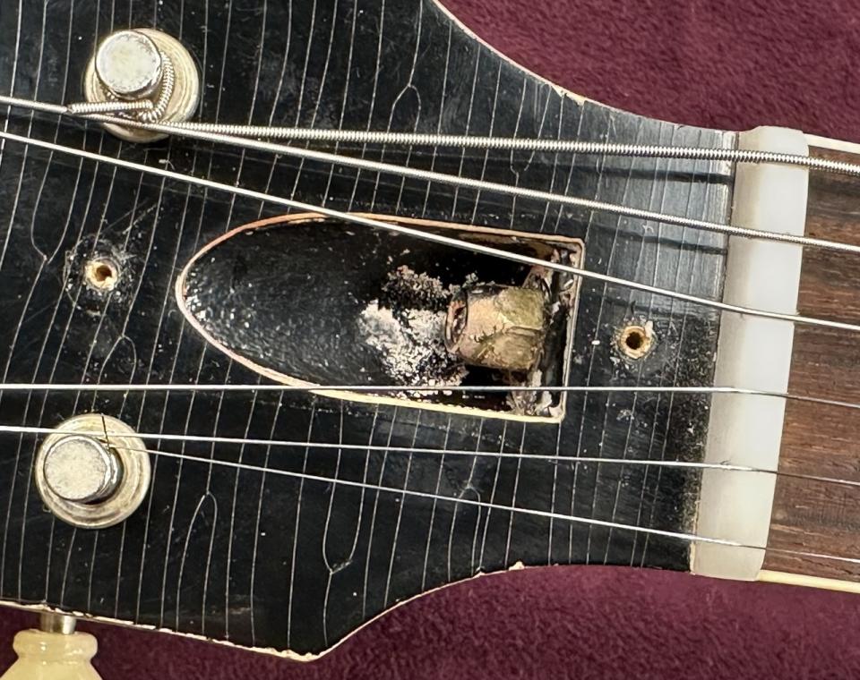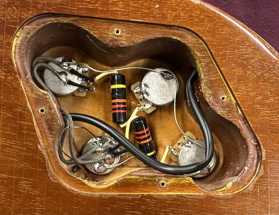 外観はコントロールノブの割れ、フロントエスカッションに弾き傷が見られますが、演奏上の問題はなくまだまだお楽しみ頂ける1本です。