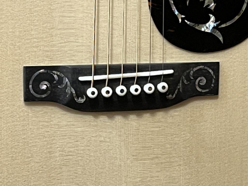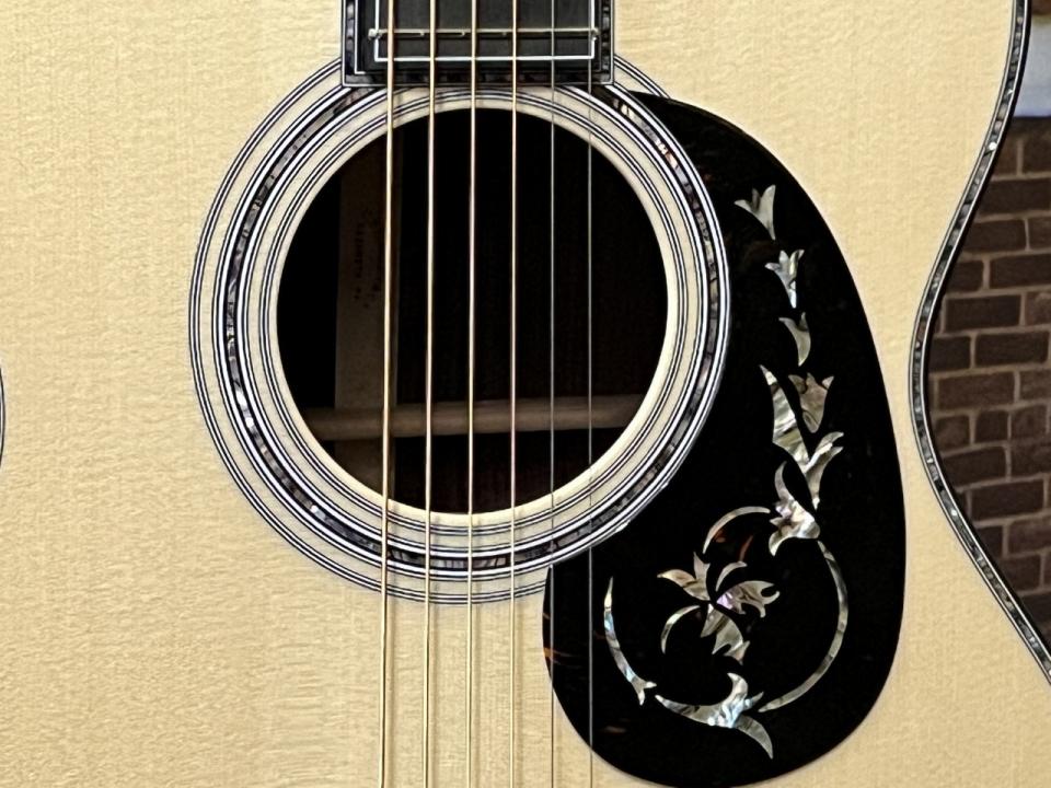 指板上にはStyle45 SnowFlakes、指板外周には白いラインが入り、ブラックエボニーブリッジ両脇にはIsland Scrollインレイ、ピックガードにもFloralインレイが施されており、各所に拘りのある豪華なカスタムモデルに仕上がっております。