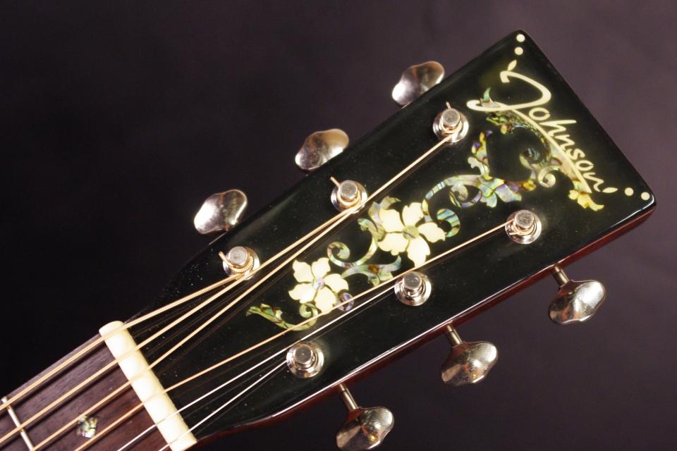 コストパフォーマンスに優れたJohnson Guitars JO26が入荷しました!!トップはスプルース、サイドバックにはマホガニーのオール単板を採用したトリプルオータイプで中国で生産されたモデルです。指板にはダイヤモンドのポジションマーク、ヘッドにも美しいインレイが入っており高級感があります。2000年代に生産が有力でペグ、ピックガード、ブリッジなど主なパーツはオリジナルで残っていました。ネックヒールへのストラップピン加工、ピックアップなど特別な加工もございません。ヘッド、ボディの所々に白濁が見れますが全体的に傷も少なく大変綺麗な個体です。弦長は約635mm、ナット幅は約44mmのやや薄めのソフトVネックで幅広い演奏に適しています。ネックのアングルも適正でトラスロッドの動作も問題なく機能しています。フレットの減りも少なめで長期で安心いただけます。弦高は12フレット6弦側で約2.6mm、1弦側で約1.7mmの高さで押さえやすく調整しています。お好みに合わせた微調整にもお応えいたします。オール単板、スキャロップドXブレーシングの影響が大きく太くて甘い豊かな響きで心地よく広がります!しっかりと音量もありストロークもパワフル!是非この機会にお試しください!ソフトケース付き