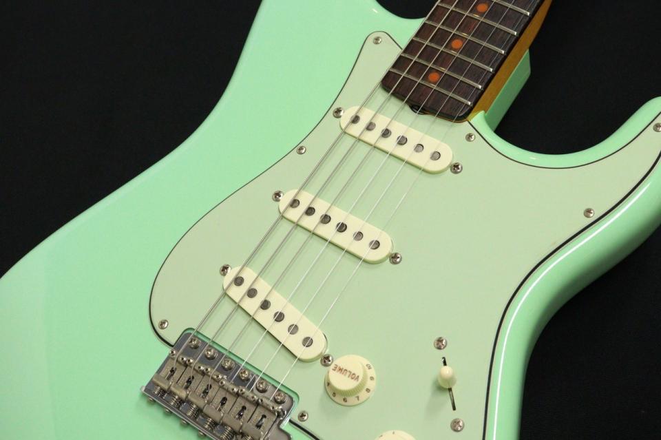 現代のプレーヤーに幅広く支持されるVintage Customシリーズのストラトキャスター。2018年製のUSED品。Super Faded Surf Greenが美しい1本です。極薄のフラッシュコートラッカーの為、細かな擦り傷・打痕などはございますが、大きく外観を損なうようなダメージは無く、全体の使用感は少なめです。