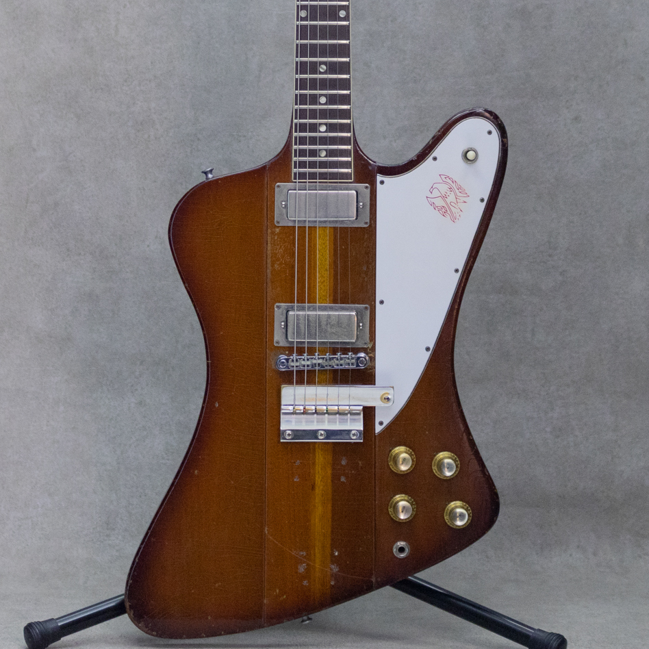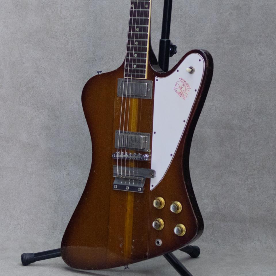 1963年登場の"Firebird"。当時ほとんど見られなかったスルーネック構造や、流線的なオフセットスタイルのボディシェイプに、中央部と両ウィング部とのボディトップギャップなど、デザイナーによる創造性を感じさせる設計もチャームポイント。60年代のGibsonエレクトリックモデル群においてシングルカットスタイルの"Les Paul"が廃盤となって以降、その屋台骨として展開されたのはSGモデルでした。対するFender社のラインナップに対抗して、SGに続きソリッドモデルの幅を広げた"Firebird"。スペックグレードを設けた展開や、その後のモデルチェンジなど異色の経緯を辿りながらも、Gibsonを代表するソリッドモデルの一つとして現在まで愛され続けています。〈Ⅰ,Ⅲ,Ⅴ,Ⅶ〉とナンバリングされての展開中、本器は2PU、ハカランダ指板にドットポジションのⅢ。Firebird登場後すぐの64年製、リバースボディ、リバースヘッド、メタルマウントのミニハムバッカー、9ピースマホガニーによるスルーネック。独特の通称"バンジョーペグ"に関しては、バンジョー用の物を流用したわけではなくこのモデルの為特別に作られたものでした。ミニハムバッカーならではのクリアで粒立ち、分離感が素晴らしい独特の歯切れの良さが魅力。歪ませた際も明るさがありながら、粘りや音の伸びを持ち合わせたグッドサウンド。こちら元々はⅢのデフォルトであるラップアラウンドスタイルのブリッジとショートバイブローラーの組み合わせだったものを、チューンOマチックスタイルのブリッジに交換、ロングバイブローラーに換装した履歴が見られます。その後改めて現在のショートバイブローラースタイルにリプレイスメントがされております。ピックガードはリプレイスメントに変更。ヘッド、スルーネック構造のプライ部分に軽いクラックの補修がございますが、しっかり修正されている為使用上の問題はございません。全体的に雰囲気抜群の細かいチェッキングが見られ、飴色に色づいたクリアが見る角度によってキラキラと反射する様子もまた、この年代のGibsonならではの風格を感じさせます。ハードウェアの変更歴等あるものの、演奏性もよくルックス・サウンドともに抜群の一本。お見逃しなく。ハードケースが付属。
