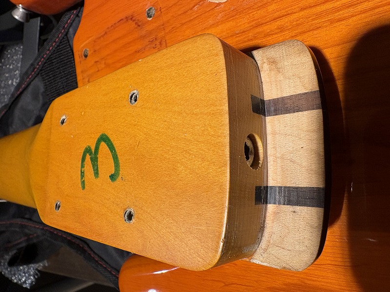 ネックのトラスロッドの左右にローズウッドの角材が埋め込まれている