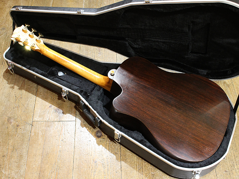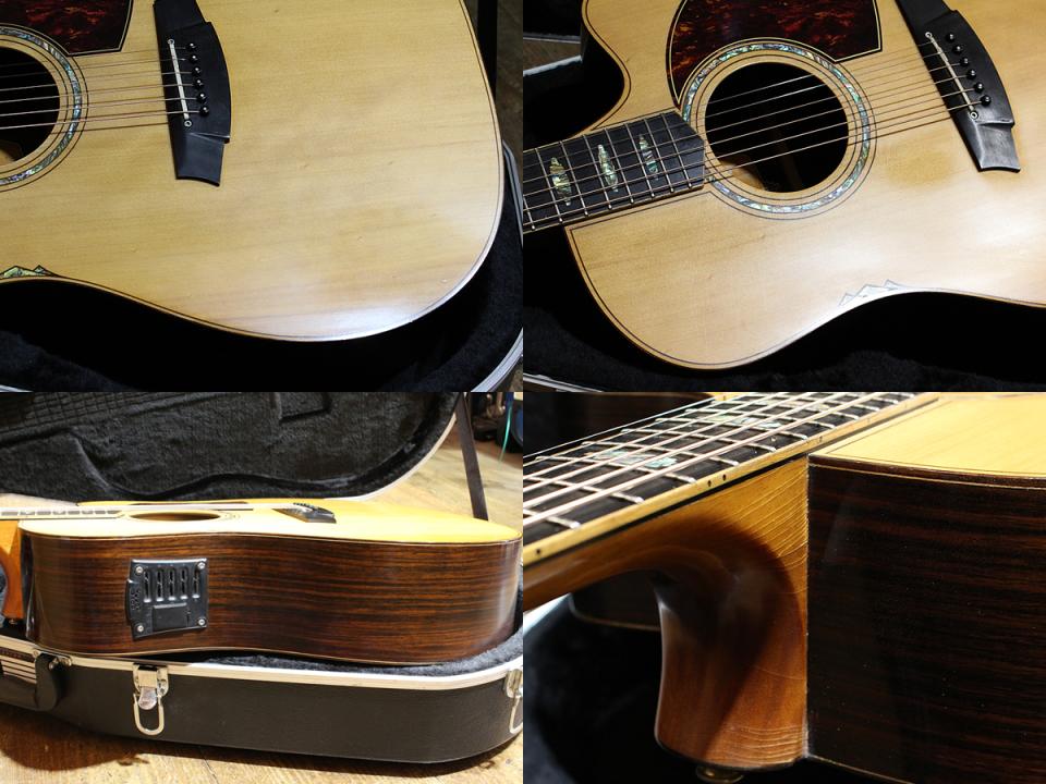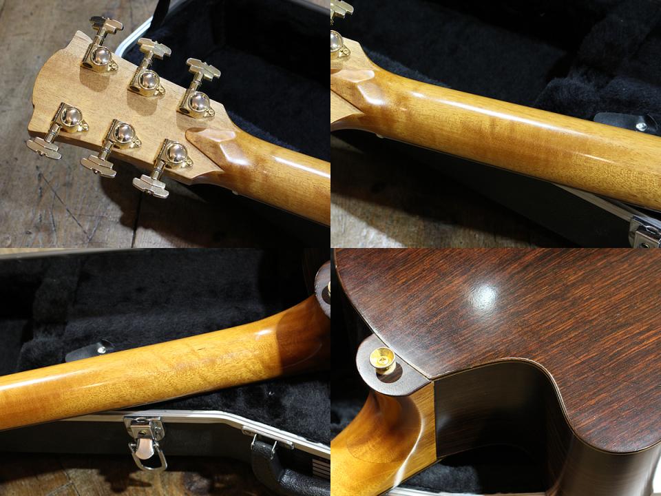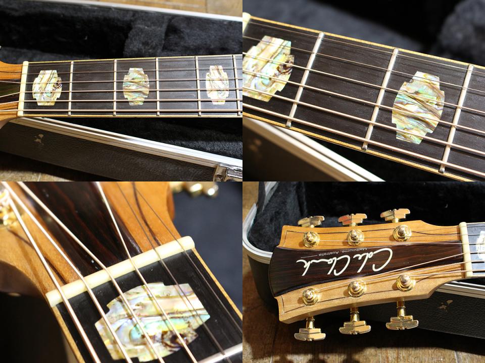 Bunyaという、Cole Clarkではメジャーなトップ材で、スプルースよりも18%強度に優れており、音響的にも伸びやかなことで採用されています。サイドバックはローズウッドです。指板はエボニー。ネックはマホガニー、に見えますがQueensland Maple。ブライトで晴れやかなサウンドが特徴的です。