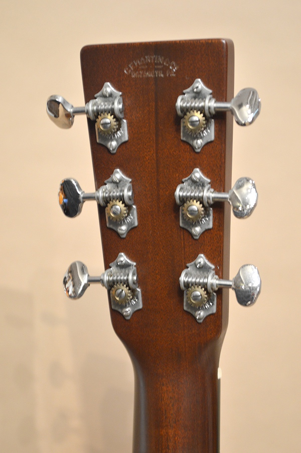 そのサウンドは反応が良く、繊細で美しいマホガニー・サウンド!レスポンス良く音が立ち上がり、マホガニーらしい透明感のあるサスティーンを伴って爽やかなサウンドを響かせます。アディロン・トップならではの太く立ち上がる出音にスキャロップ・ブレーシング特有のバウンと弾むような豊かな低音、マーチンらしい柔らかく弾力性に富んだ中域、マホガニーらしい艶と色気たっぷりな高音などが混然一体となり、ボリューミーながら爽やかな、マーチンらしい耳当たりの優しいサウンドをご堪能頂けます!同時期に発売されていたD-18Vも非常に人気がありましたが、やはりネックが太く、アディロン・トップという事もあり存在感が全然違います。太く粘るような、且つマホガニーらしい爽やかさも感じられるサウンドはさすがゴールデン・エラ!と大納得する事間違いなしの素晴らしいサウンドかと思います!