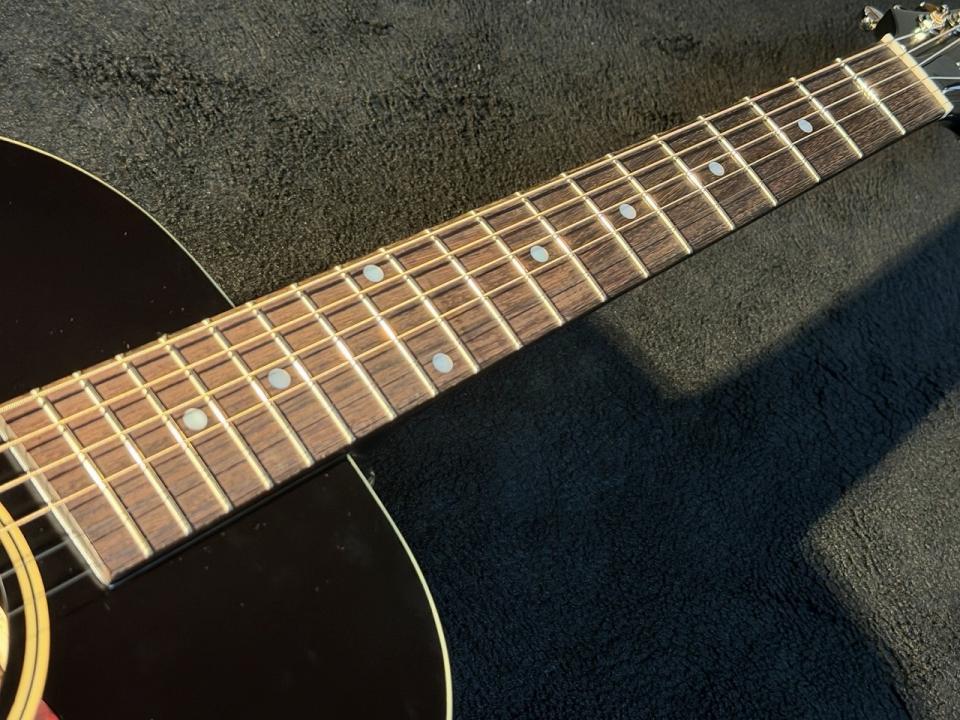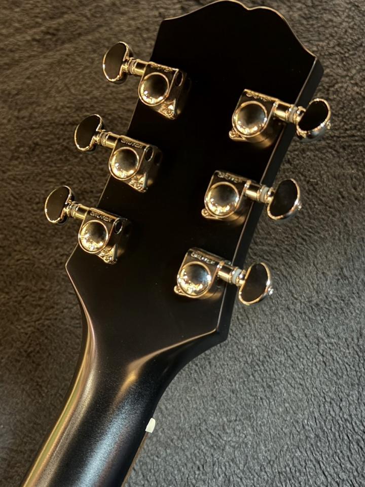 オール単板で構成される木材はスプルース×マホガニー。ワンピースマホガニーのネックにローズウッド指板。Epiphoneブランドとしての主張として幅広な1960年代のカラマズーシェイプのヘッドを採用。
