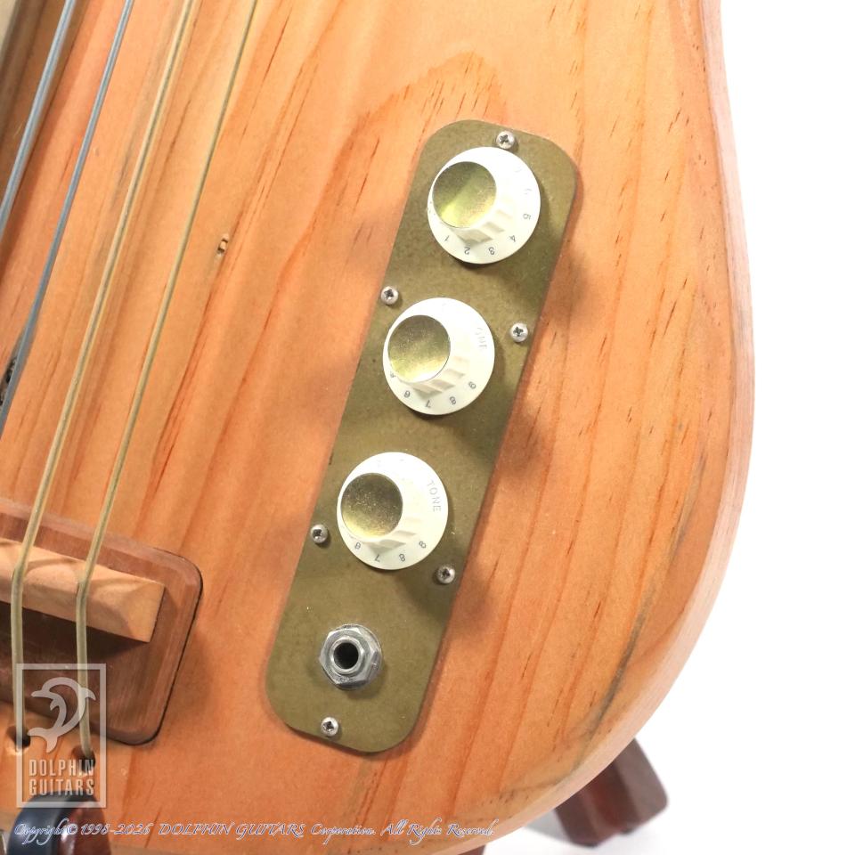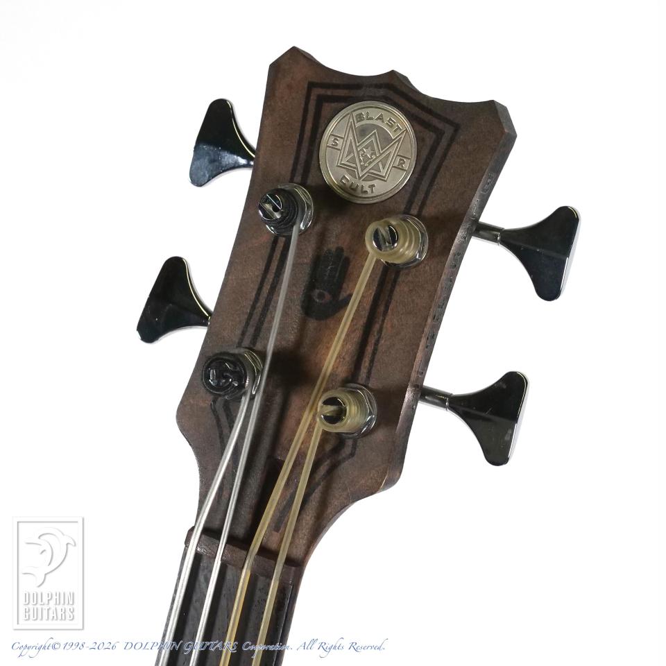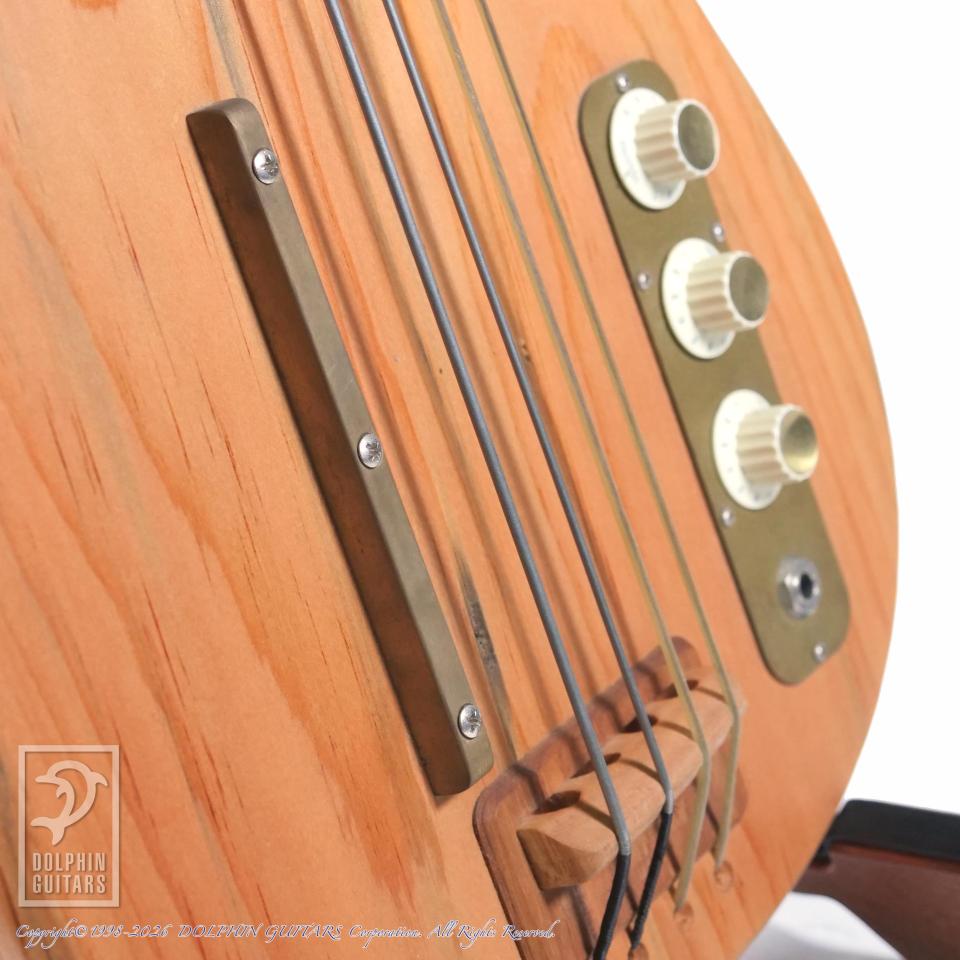 ブルー・パインと呼ばれている虫食いされた材をアコースティカルに響くと言う理由で斬新にも使用し、アップライト・ベース用ピックアップに搭載されているピエゾP.U.を流用して搭載。マグネット・P.U.よりも、よりアコースティカルさを実現しました。そのピエゾP.U.は、取り付けられたボルトでこのピックアップに圧力をかけて音を出してるが、圧力を受け止める鉄板を色々試した結果、1950年代のカミソリが一番良い音を出したらしく、その素材を分析し当時のカミソリと同じものを使用しております。この辺りもブラストカルトの狂気じみた拘りが分かるエピソードです。