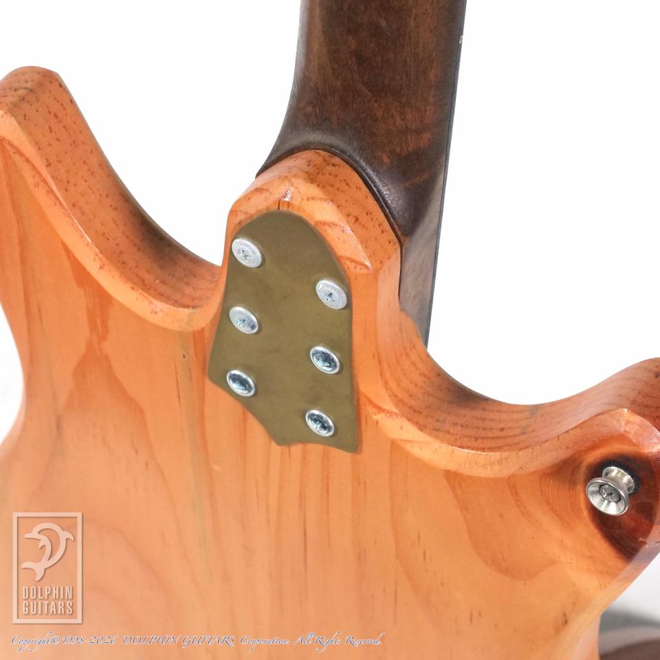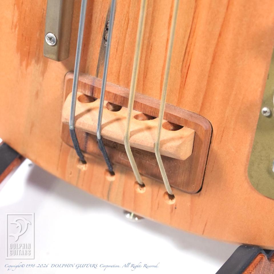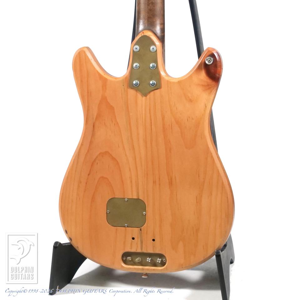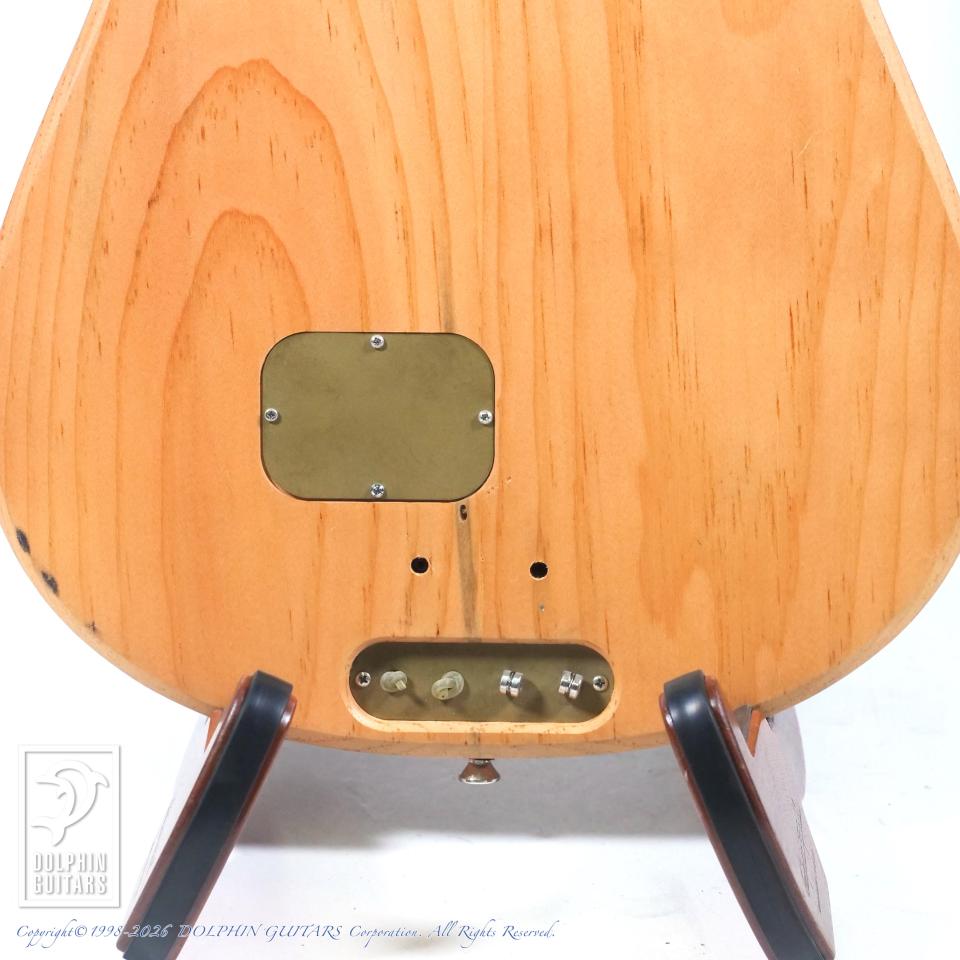 ブルー・パインと呼ばれている虫食いされた材をアコースティカルに響くと言う理由で斬新にも使用し、アップライト・ベース用ピックアップに搭載されているピエゾP.U.を流用して搭載。マグネット・P.U.よりも、よりアコースティカルさを実現しました。そのピエゾP.U.は、取り付けられたボルトでこのピックアップに圧力をかけて音を出してるが、圧力を受け止める鉄板を色々試した結果、1950年代のカミソリが一番良い音を出したらしく、その素材を分析し当時のカミソリと同じものを使用しております。この辺りもブラストカルトの狂気じみた拘りが分かるエピソードです。