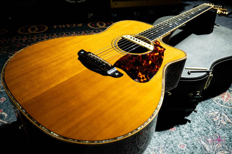 今回入荷したモデルはドレッドノートより少し小ぶりなボディが特徴のカッタウェイありモデルとなります。
