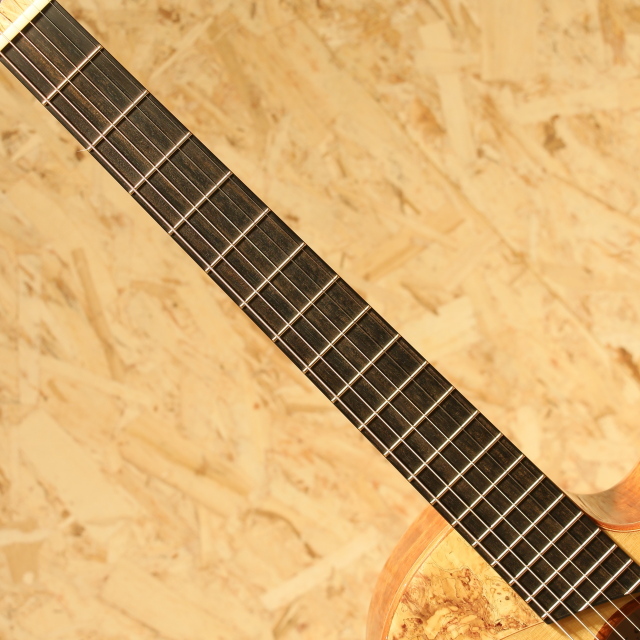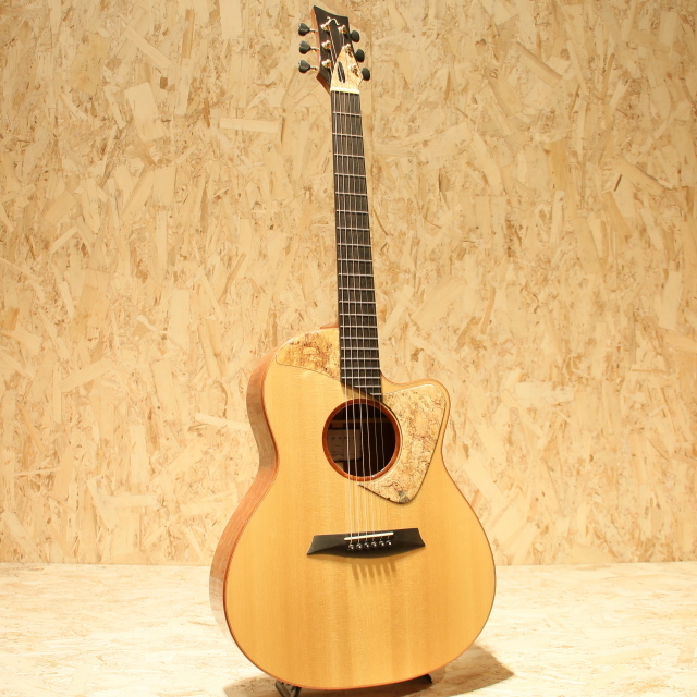 イタリア・ソリゲットにてギター製作をする"Noemi Guitars"のNoemi Schembri。カナダのマスタールシアーSergei De Jongeの所での修行経験を持つイタリアのルシアー。多国語を堪能に操る事ができる彼女は、Roy McAlister, Jean Larriveeなど数多くのベテランルシアー開催の製作コースにて翻訳を手伝うキャリアも持つ逸材です。本器は、彼女のオリジナルシェイプモデル"The Wedge Cutaway"。40cm(約15.7")のロウワバウトを持つテーパードボディのSJモデル。トップには柾目痕が揺らめく美しいイタリアンスプルース、サイド&バックには全面に玉杢が揺らめくサペリマホガニーを使用。サペリマホガニーネック、エボニー指板&ブリッジ、エボニー天神板、エボニーボタンGOTOH510ペグ、サペリマホガニーロゼッタ、サペリマホガニーバインディング、背の低いXブレイシング。特徴的なバール材を用いたピックガードとトップ&ヘッドインレイデザインの本器。1弦側ロウワバウトから6弦側アッパーバウトに向けてテーパーが付けられたテーパードボディ。優しくふくよかでボリューミーな響き。決して眠たくなく、しかし耳障りな金属音を感じさせない柔らかな響き。フィンガータッチでも十分に大きな音量を奏でるレスポンスを併せ持ちます。強いタッチの入力でも暴れず、小気味良い響きから大人しいメロウな響きまで巧みにこなしてくれます。また女性ならではか、とても美しい仕上げも魅力のひとつ。眺めて奏でて愛でて嬉しいイタリアメイドの1本です。本器は2019年にSound Messe in Osaka2019のショーモデルとして国内初入荷となった1品です。是非お手元でお確かめください。