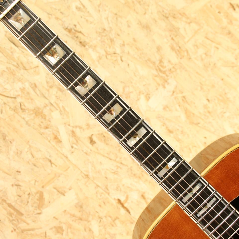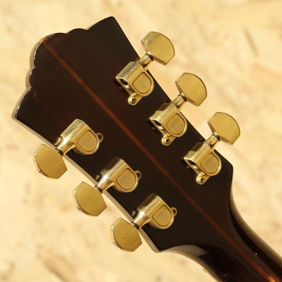 1968年にカスタムメイドモデルとして市場に登場し、1976年にレギュラーラインとなったフラッグシップモデル"D-55"。1960年代にはSmothers Brothers ShowのTommy Smothersらが使用したことで、人気を博し、Waylon Jennings、Billie Joe Armstrong、David Nailなどのアーティストたちが使用したことで数十年に渡り世界的に有名で人気なモデルとなりました。本器は1978年製、レギュラー生産が始まった比較的初期頃の1本。スプルーストップ、インディアンローズウッドサイド&バック、マホガニーネック、エボニー指板&ブリッジ、刻印入りオリジナルゴールドシャーラーペグ、パール&アバロン指板インレイ、オリジナルピックガード、ノンスキャロップドXブレイシング、ナチュラルカラー。無骨なサウンドはハードなストロークプレーにハマりますが、ギルドの最高級モデルだけあって響きにしなやかさがありますし、倍音も豊かでリッチに聴かすことのできるギターです。1952年に設立されたギルドギターはアーティストに厚く指示されている頑丈な楽器で、国内外を問わず多くのミュージシャンが使用しています。ピックガード左上部ネック付近とピックガード左下部内側にガードクラックがありますが修正されておりよく見れば跡は分かるものご使用上の影響はありません。1弦側サイド面に3cm程の割れ修正跡がありますが、内部までは貫通しておらずリペア済です。バック面に棒状のようなものが押し当てられた形跡があり、塗装がやや変形しておりますがこちらも表面上のものでご使用への影響はありません。年代物ですの塗装面の打ちキズや細かな打痕等はありますが、痩せはほとんどなく厚みのある風合いの良い塗装コンディションです。ネック裏も経年使用により塗装の剥がれが見られ、この年代であれば致し方ない症状ですが触った際の不快感などはありません。サウンドホール周りのピッキングウェアなどしっかりと使い込まれてきたことのうかがえる本器。年代を象徴するややフォーキーなプレイアビリティで芯の太い大きな鳴りが特徴の1本。ネックコンディションも良好です。昨今、見かける個体も少なくなってきている"D55"、是非お早めにご検討ください。オリジナルハードケースが付属します。