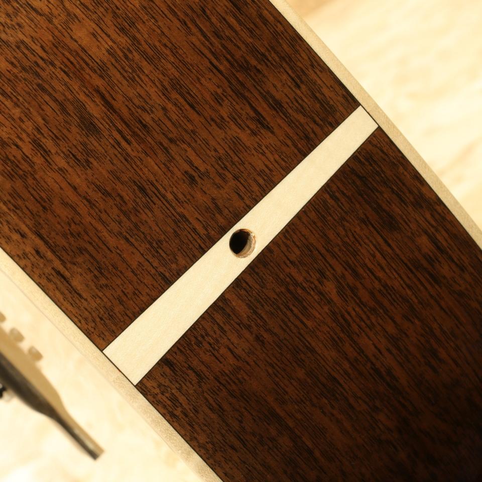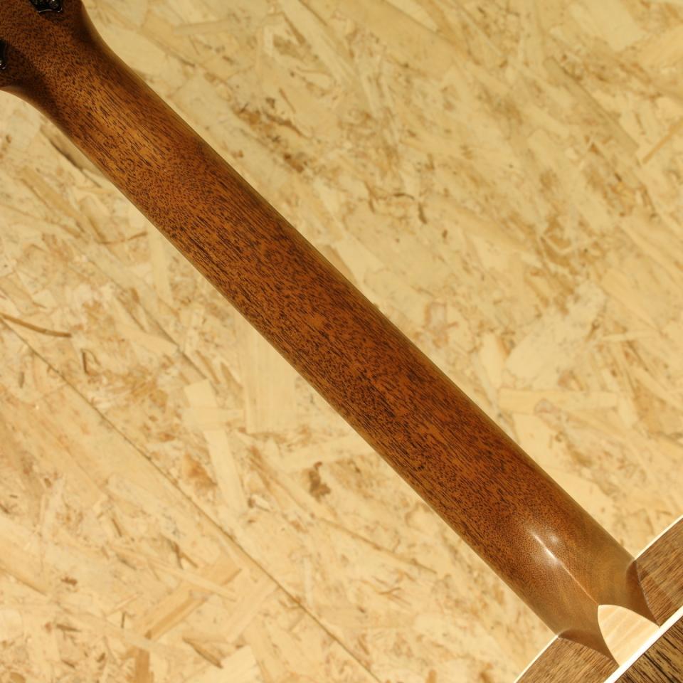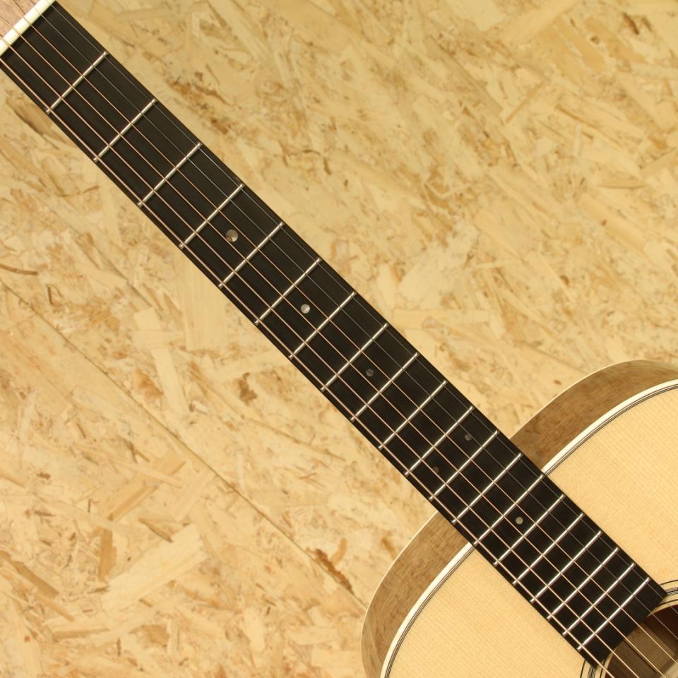 現マーチン工場の中でも、卓越した技術と豊富な経験から至極のギターを造り出す"Martin Custom Shop"。レギュラーラインとは全く異なった環境、工程にて製作。工場の一角に専用の区画があり、昔ながらの工法を継承しながらより精度の高い製作を行っています。ラインナップ上最高峰と言えるオーセンティックシリーズの製作をはじめ、高い完成度を誇るカスタムモデルを製造するトップクラスの部門です。本器は現地工場へ赴いたディーラーのみオーダーが出来たカスタム品”CTM D-18 BlackWalnut”。スプルーストップ、ブラックウォルナットサイド&バック、ジェニュインマホガニーネック、44.5mmナット幅、モディファイドローオーバルネックシェイプ、ハイパフォーマンスネックテーパー、ブラックエボニー指板&ブリッジ、ドットアバロン指板ポジション、ヨーロピアンフレイムメイプルバインディング、グローバーオープンバックバタービンノブペグ、ベッコウ柄ピックガード、オールドスタイルヘッドロゴ、2wayアジャスタブルロッド、フォワードシフテッドスキャロップドXブレイシング。珍しいウォルナットサイドバックのカスタムモデル、以前のラインナップや限定モデルで僅かに見られる仕様です。ヘッドの突板にもウォルナットを使用しており、全体的に淡いペールカラーの印象を受けるギター。バックにはサップも入り、ボディバインディングのフレイムメイプルと色合いがマッチングしています。そしてブラックエボニーでデザインをキュッと引き締められており、メリハリの効いた爽やかな1本に仕上がっています。演奏性の面では今やお馴染みとなったモディファイドローオーバルネックを採用し、ポジションを問わない演奏性を獲得。ナット幅44.5mmでフィンガースタイルにも対応しやすい現代の標準仕様を踏襲しています。そしてサウンド面、元よりカスタムショップ製のギターは音の情報量が多く、輪郭の明瞭さや中域の密度感の高さを感じられます。そこにウォルナットの特性が合わさり非常に抜け感の良いオープンなトーンを生み出しています。ウォルナット自体、低域の出方はマホガニーのように軽快で乾いた風合い、高域の伸び方や艶やかな音色はローズウッドにも似ており、特に中高域のブライトさや押し出し感は両者にも無い特徴です。各弦の音の分離感も非常に良好、しっかりとコードの構成音を聴かせたい時、そしてメロディラインを聴かせたい時にもこの特性は有効。ギターの美味しいポイントを出しやすいためギターを主役に据えた演奏にも最適、また低音が重すぎずカラッとしているトーンはレコーディングでのマイク乗りも良さそうなサウンドです。演奏スタイルも多様化している現代において、新しい選択肢になり得るポテンシャルを持ったカスタムショップ製D18。四季それぞれを儚さや憂い、淡さと異なった雰囲気で彩ってくれそうな1本。現行Martinの最高峰チームが作り上げる挑戦的なギター。是非お試し下さい。