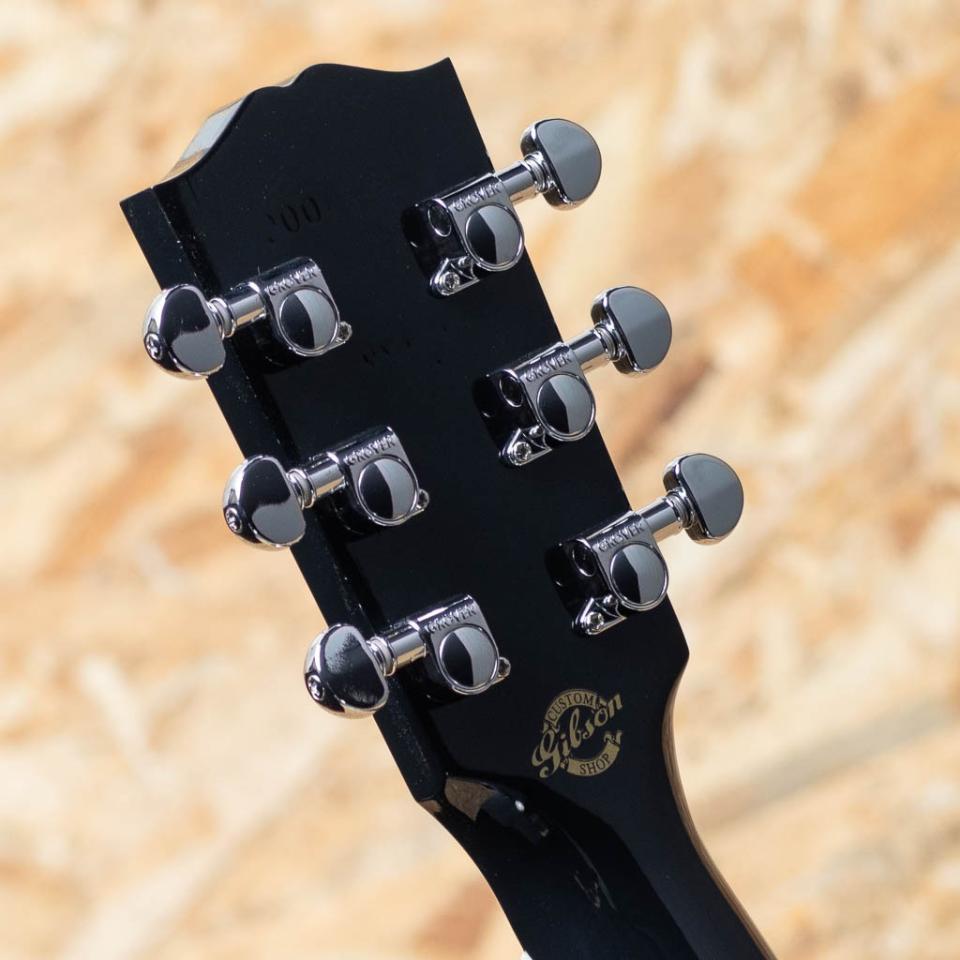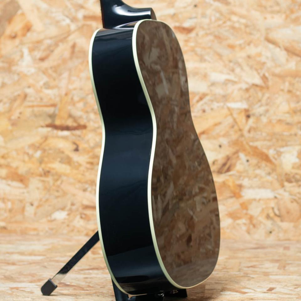 1932年に発表された歴史的銘器"L-00"の新基準のスタンダードモデル"L-00 Standard"。本器はエボニーブラックフィニッシュにホワイトカラーのピックガードを採用した弊社オーダーモデルの1本。シトカスプルーストップ、マホガニーサイド&バック、マホガニーネック、ローズウッド指板&レクタングルブリッジ、グローバーペグ(スモールノブ)、パールヘッドロゴ、スキャロップドXブレイシング、L.R.Baggs社製 Element VTCピックアップ標準装備。15インチ弱のコンパクトな薄胴ギターですが、フルボディのJ-45に迫るボリュームも合わせ持っています。指板サイドにはスムーズな運指をフォローする丸みを帯びた処理が施されています。搭載のPUは1ボリューム1トーン仕様のシンプルな操作でより幅広いユーザに向けて、より幅広いサウンドメイクが可能となります。歯切れ感の強い音で、気っ風がよく、サイズ感以上のボリュームを体感できます。ギブソンの味ともいえるサステイン短めのクリアなトーンが持ち味です。カントリーブルースやラグタイムなどの奏法や、ストロークとアルペジオを交えた弾き語りにも最適です。ステージなどでも映える、ルックス抜群のオーダー品です。