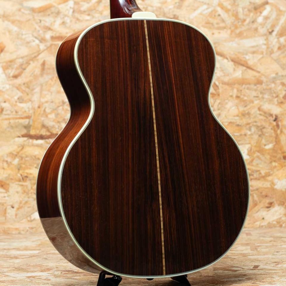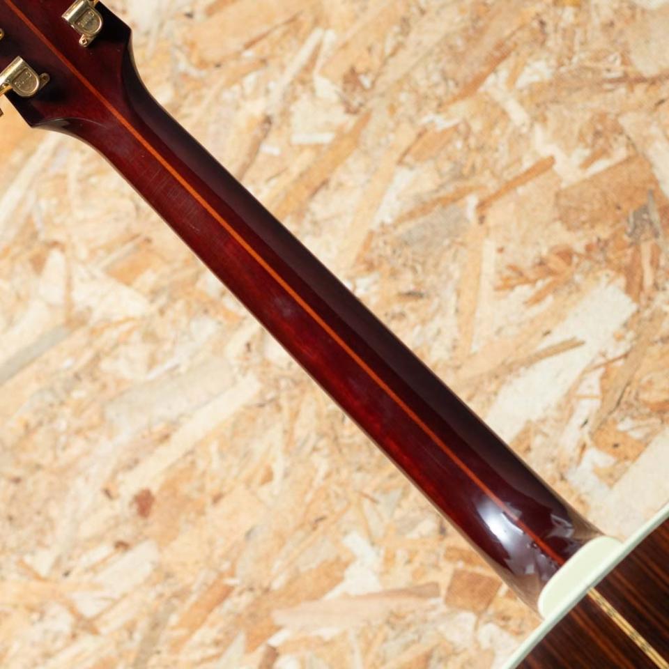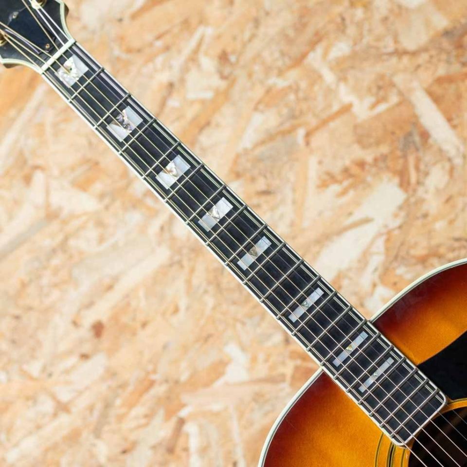 かつてのアコースティックギター御三家ブランドの一つギルド。1952年、ニューヨーク・エピフォン時代の職人達により産声を上げたギルド・ギター。多くのミュージシャンと契約をし、表舞台で活躍するメイドインUSAの古き良きブランドとして名を馳せていました。本器は17インチ幅のボディを持つ定番ジャンボギルド"F-50R"1976年製。スプルーストップ、ローズウッドサイド&バック、マホガニーネック、エボニー指板&ブリッジ、オリジナルピックガード、アバロン&パール指板ポジション、オリジナルゴールドペグ、ノンスキャロップブレイシング。打痕や塗装の曇り、バインディングの亀裂など、経年相応の使用感はありますが、大きなダメージはございません。弦高調整のためにサドルはギリギリまで低く調整してありますが、弦高は高めの状態のため、繊細でテクニカルなプレイではなく、がっしりとかき鳴らすようなスタイルにマッチします。また、アンダーサドルパッシブPUが後付されております。無骨で重量感のある音色は健在でギルドらしい重く硬派なサウンド。ピアノを思わせるような深みのあるサウンド、スーッと伸びて行くサステイン、レンジ感こそ広くありませんがこの時期特有の芯の強さや太いサウンドが病みつきになる一本です。汎用ハードケースが付属します。