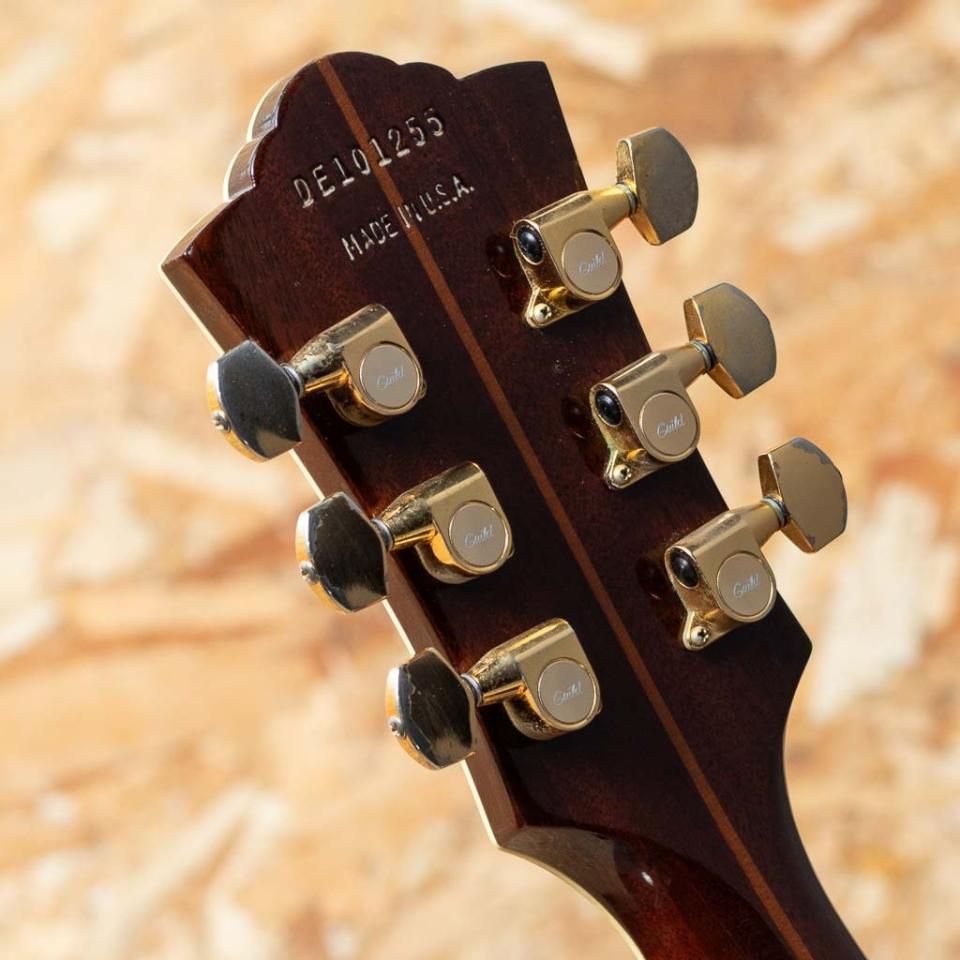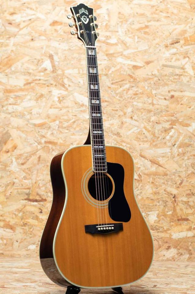 Paul Simon (ポール・サイモン)やJohn Denver (ジョン・デンバー)、Nick Drake (ニック・ドレイク)等、数多のフォークシンガー達が愛したGuild (ギルド)。現在もコアなファンからの支持が手厚い事で知られ、愛好家の間で密かに人気のある玄人好みなギターブランドです。本器は、ゴージャスなルックスとパワフルなサウンドで人気だった当時のフラグシップモデル"D-55NT"。こちらは1984年製のUSED品。スプルーストップ、ローズウッドサイド&バック、エボニー指板&ブリッジ、パール&アバロン指板インレイ。ハイエンドモデルならではの適度にリッチでゴージャスな装飾も美しく、見た目にもクールな人気モデル。豪快でありながら繊細さも併せ持つ音のバランス感に富んだサウンドです。ネックヒールにストラップピンの増設、ピックガードの内側下部にピックガードに沿ってクラックの補修が行われております。過去にピックアップが取り付けられており、エンド部は拡張されております。サドルにて調整が行われており、サドルの残り高はあまりない状態です。傷・打痕等は見られますが年代を考えるときれいな状態が保たれており大切に使用されていたことが伺えます。最近では中古品の流通も少なくなってきた人気のフラッグシップモデル。オリジナルハードケース付属です。