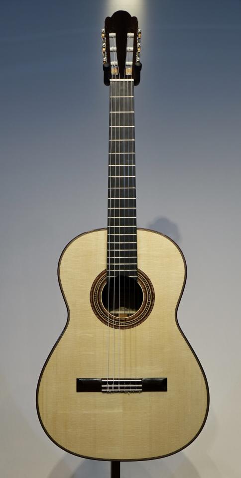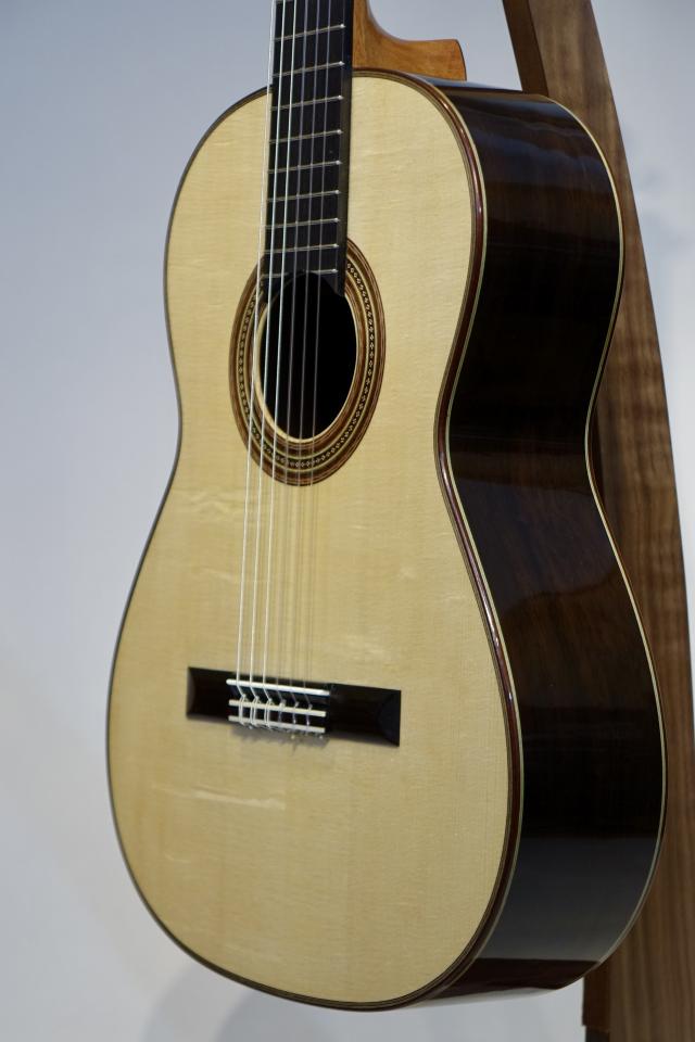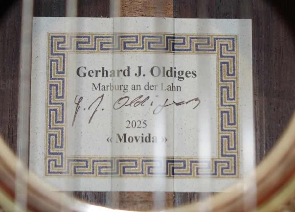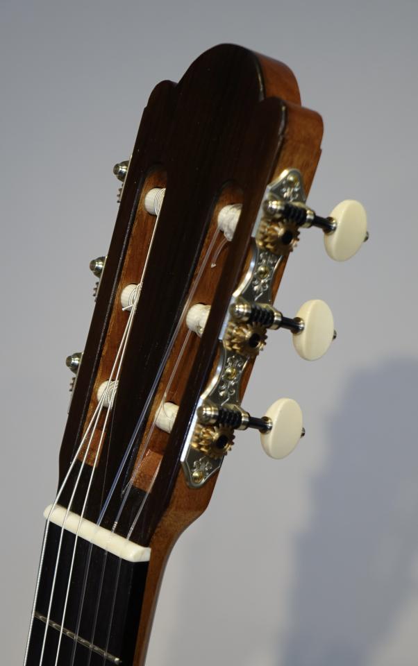 この楽器は弦長630mmのハウザーモデルで、「Movida」と言う名がついています。バランス良く芯があり、高音はリッチな響きで、低音の鳴りは粘りがあり豊かです。3弦の音の輪郭がくっきりとしていて、内声が良く聴こえます。ハウザーの良い所を継承しながら彼の求める音に仕上がっていると言えます。各音のバランスも抜群で大きなホールでも隅々まで響き渡ってくれるでしょう。弦長630mmの特注品でとても弾き易く、非の打ちどころのない、とにかく素晴らしい仕上がりです。糸巻はシェラーが装着されています。シェラーはドイツのエンジニアでありギター奏者でもあるクラウス・シェラーによって2008年に発表された糸巻で、装飾も美しく、なにより正確でストレスなく調弦ができます。