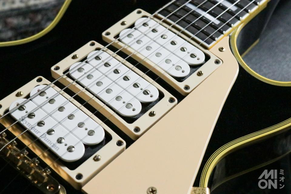 ピックアップは全て変更されており、本来は定番の「57 Classic」ハムバッカーピックアップが搭載されていますが、こちらは「Seymour Duncan SH4」のホワイトカラーを3基搭載。ダンカンピックアップの中で最も人気のあるモデルで、高い出力でアンプをプッシュし、多くの倍音を得ることができます。