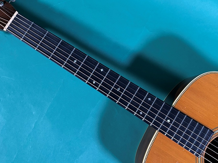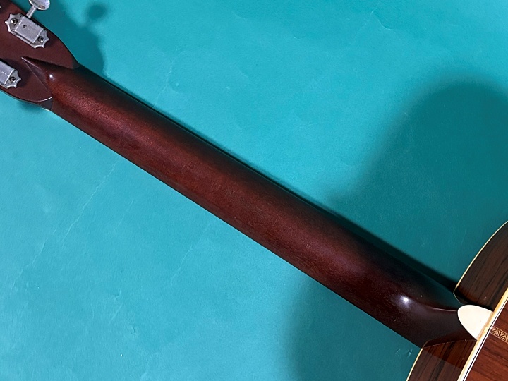 サイド、バックにブラジリアンローズウッド、スクエアーのプリウォースタイルヘッド、アバロンスクエアースロットポジションマーク、寄木細工のヘリングボーンバインディング、ロングスロットブリッジです。