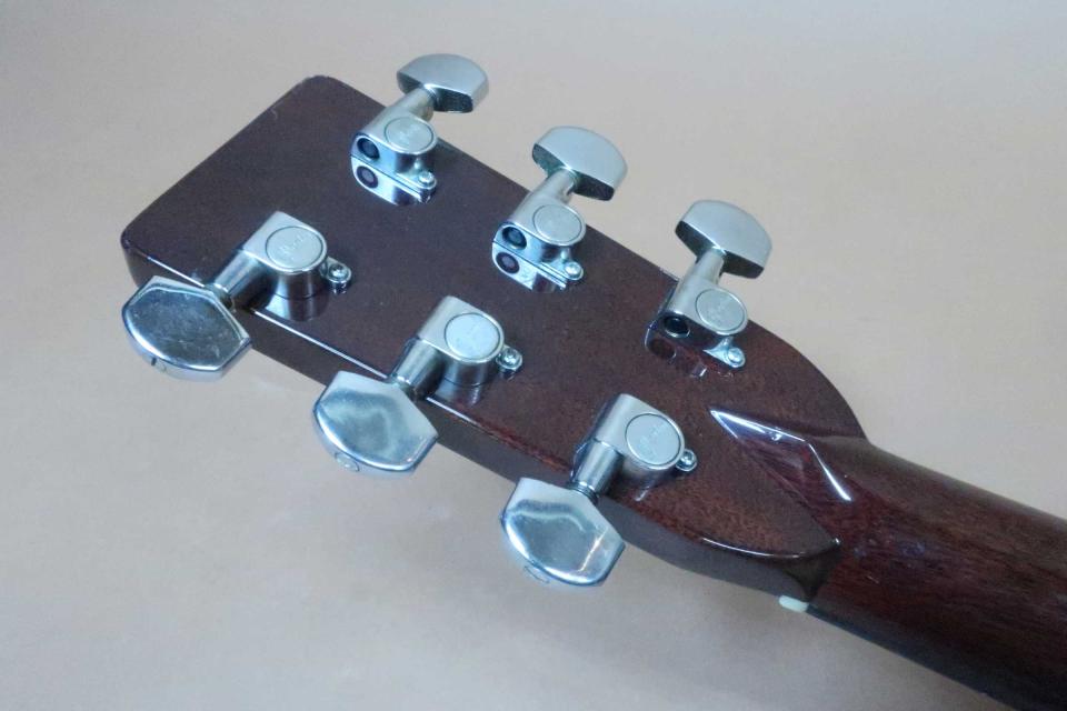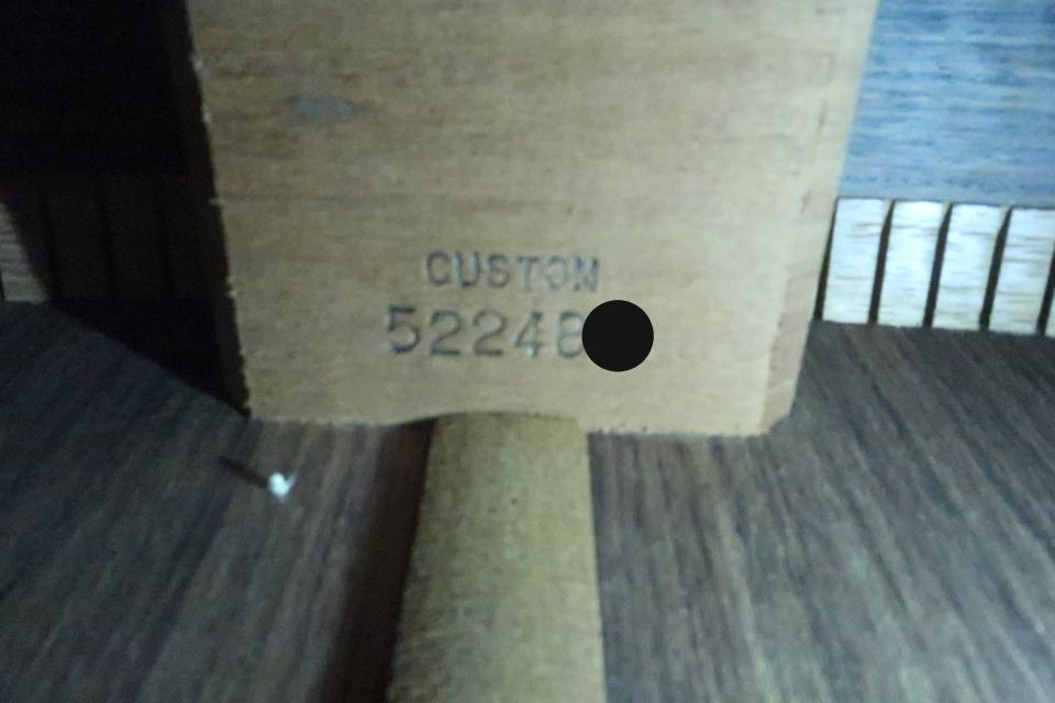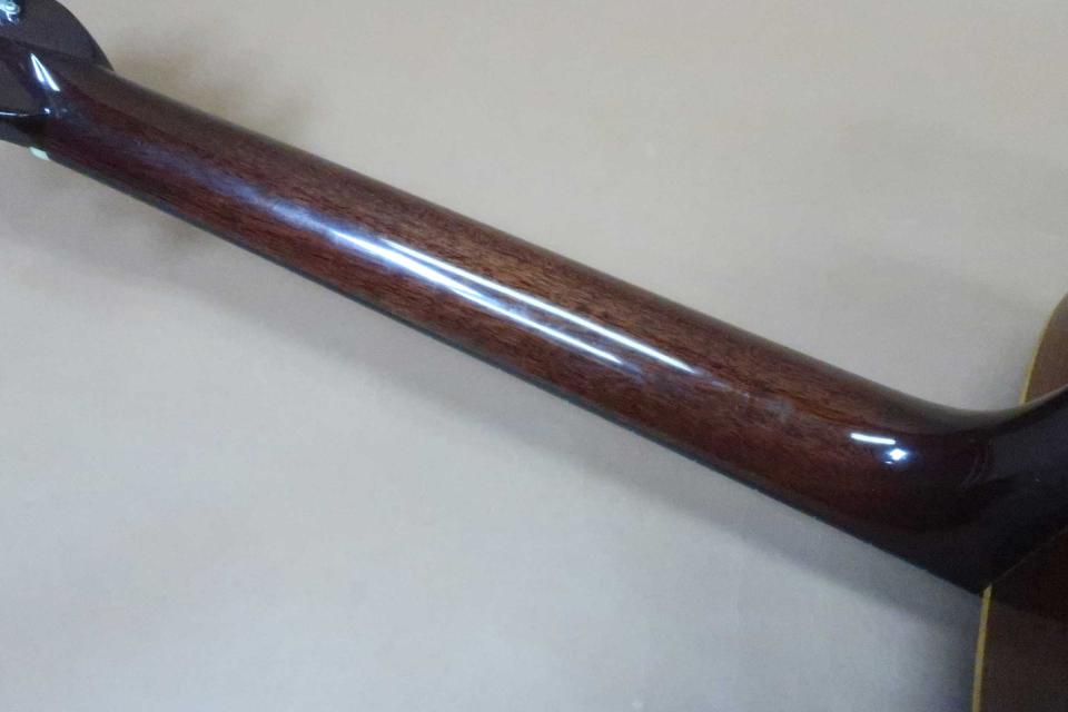 サウンドはノンスキャリップドXブレイシングが採用され、低音は低音らしく野太く奥行きの有る鳴りで、中域の熟れた音の立ち上がりとサスティーンが心地良く、また高音域の艶の有る煌びやかで広がりの有る倍音が心地良い鳴りの逸品です!フィラットピッキングはもちろん、フィンガーで爪弾いても抜群の鳴りでリアル・ヴィンテージにも匹敵するお勧め品です!状態はペグの曇りも無く輝いており機能的にも問題はありません。トップは年代相応の日焼けがありリアル・ヴィンテージの渋さがあり、ピックガードとサウンドホールの僅かな隙間にスクラッチ傷とピックガード下など塗装上のスクラッチ傷や軽い打痕などありますが年代相応ので打パッと見た感じでは酷く目立つ酷いダメージは見受けられません。サイド&バックも年代から考えれば綺麗な状態を保っておりバインディング角に軽い打コンはありますが目立たないレベルです。本ギターも経年のバインディング浮きの修理が施され、収縮による縮みをバックのネックヒール下で補強した跡が見られます。また入荷時にウエストのバインディングに僅かな浮きが見られましたので当店で修理済みです。またネック裏のベタつきがあったのか綺麗にリフィニシュされフレットも交換をされておりプレヤビリティは良好です。弦長約645mm、ナット幅約43mm、弦高は12F6弦で約2.5mm、1弦約2mmと標準的でサドルの余裕も僅かに有りネックの反りや元起も見受けられず、フレットの減りも僅かでネックを含めプレイヤビリティも良好です。オリジナルハードケース、取説も付属しています。年代なりの調整が施され、バインディング等の修復歴有りの特価品です。稀少なギターですがお買得価格に設定をさせて頂きました、是非この機会にお試し頂ければ幸いです!
