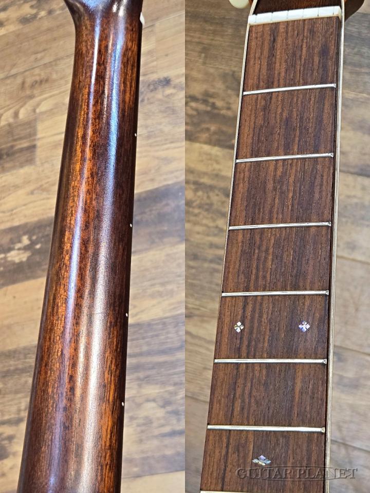 トップのピックガードが貼られる位置に使用に伴う傷と摩擦による塗装の艶、ネック裏に擦り傷と摩擦による塗装の艶、若干のフレットの摩耗が見られますが全体のコンディションは良好です。